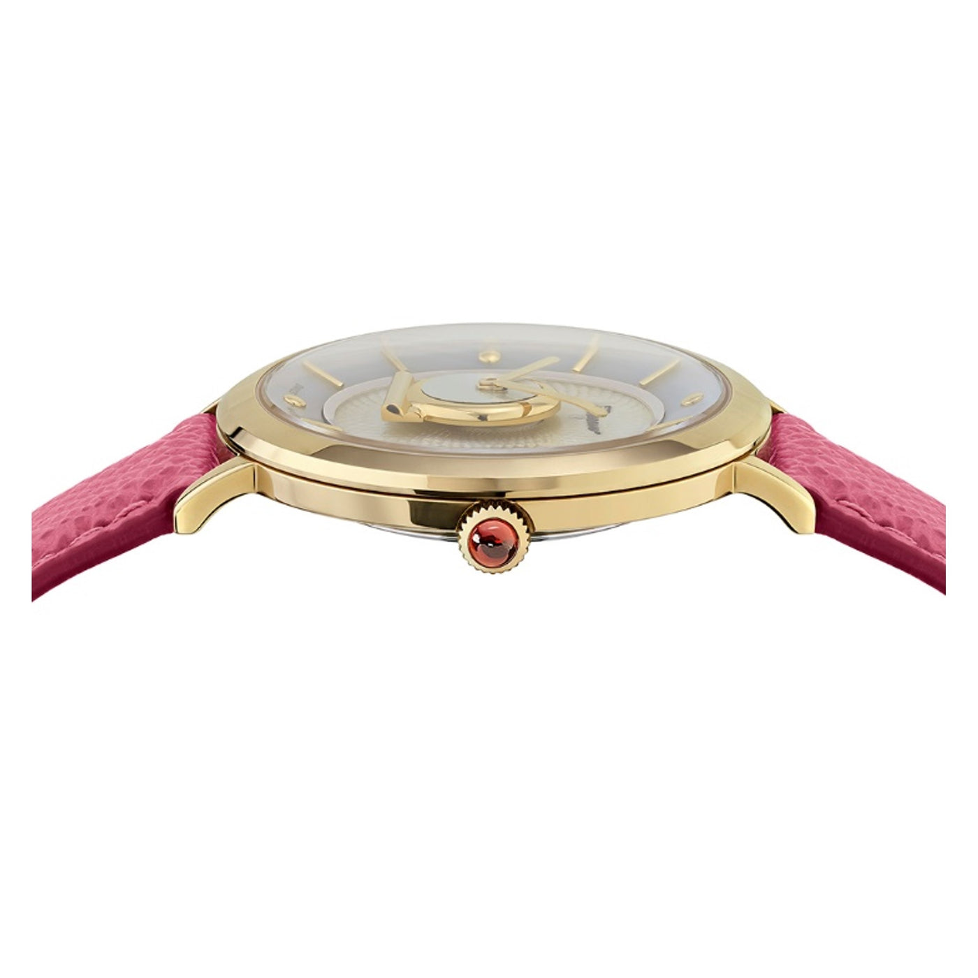 The case, in steel or IP champagne, has been given a slimmer and more circular design for increased comfort, while the new domed crystal elevates the dial’s union of aesthetics and functionality.