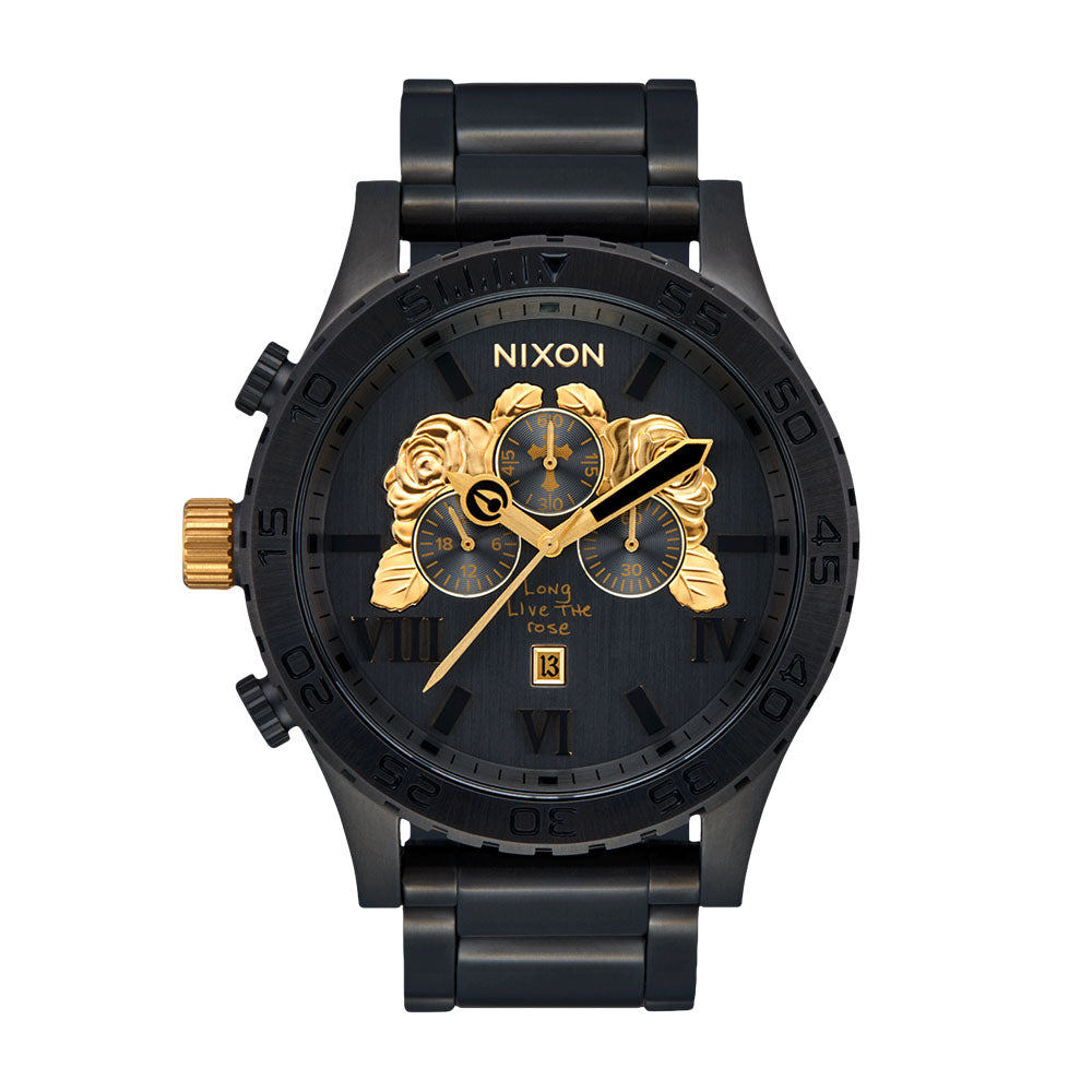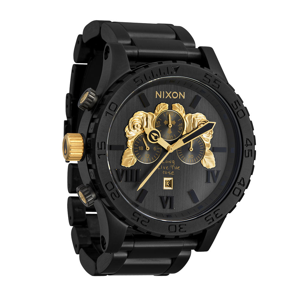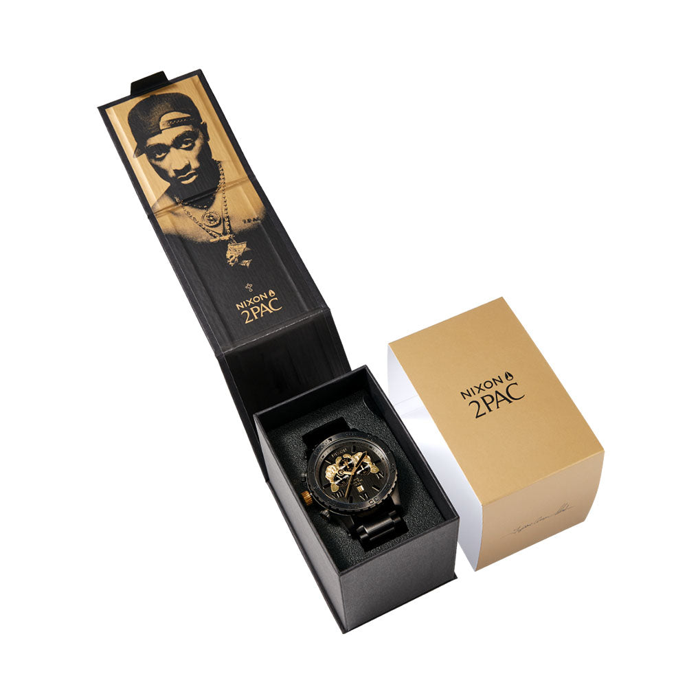 The classic OG oversized timepiece showcases 3 gold roses on a custom black dial, black raised Roman numerals, and a custom 2PAC hit on the bezel above the crown. Elevating the design's sophistication are two specially colored push buttons.