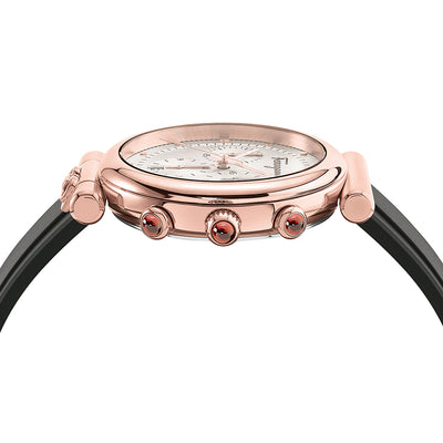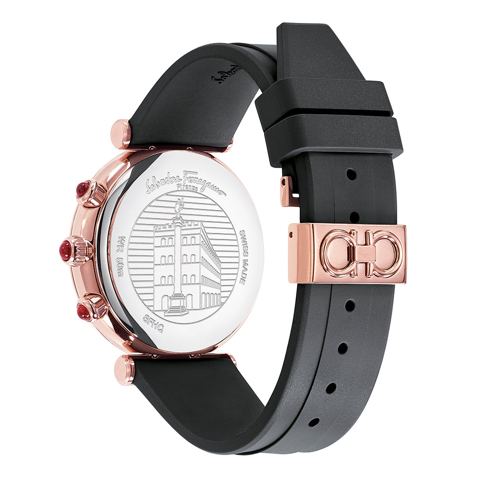 The Double Gancini logo on the lug at 6 o’clock, the guilloche dial with small studded indexes, or the cabochon topping the crown and the buttons, are elegant details that don’t alter its decidedly casual look.