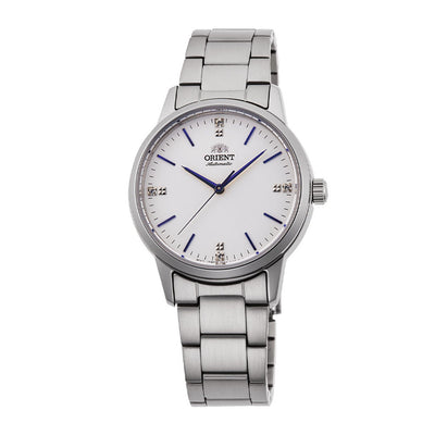 This sophisticated 32mm Contemporary mechanical watch showcases a stainless steel case and a stylish white dial.Complementing its sophisticated design are a stretched straight bar index and an hour markers of rhinestones on the dial.