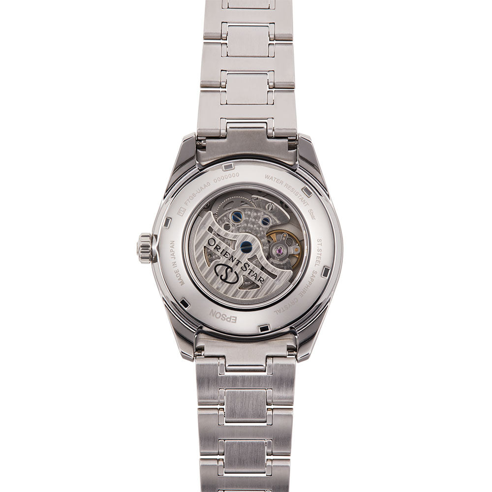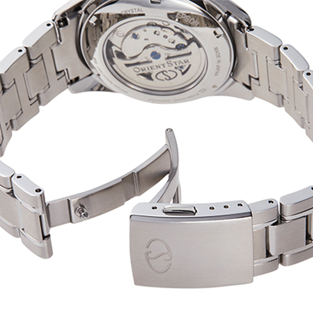 Our premier ORIENT STAR features this elegant 40mm stainless steel mechanical watch, showcasing a beautiful case and lugs. Completing the watch?s distinguished aesthetic is dial, sub-dials for power reserve and seconds, stylish hands and a hand-wound crown with automatic self-winding functionality. Matching its case, the hour markers give this exquisite watch the perfect touch of sophistication. The impeccable craftsmanship of the case frames the meticulous movement of the watch, protected by sapphire crystal. Roman numerals are tastefully placed at the 12 o?clock position. Anti-reflective coating glass delivers increased visibility, suppressing reflection while adding improved scratch and stain resistance. The timepiece supports a continuous running time of 50 hours and water resistance of 50 meters.