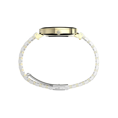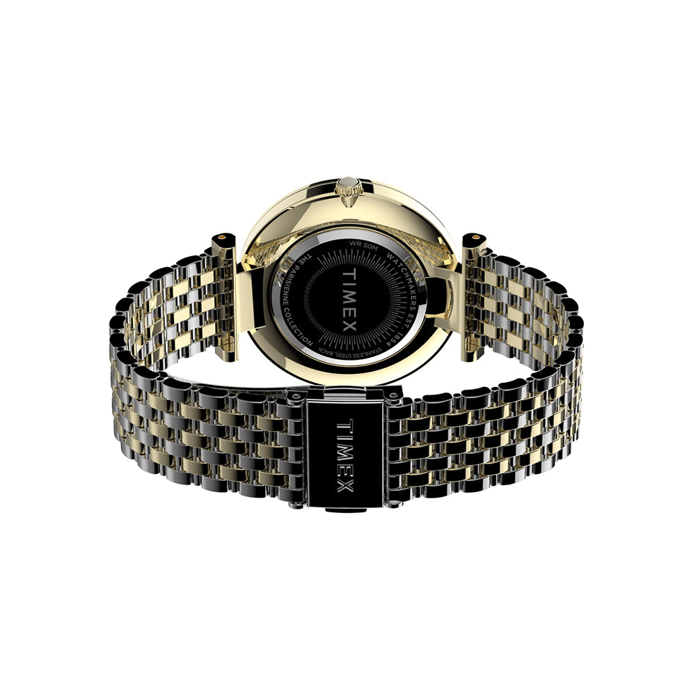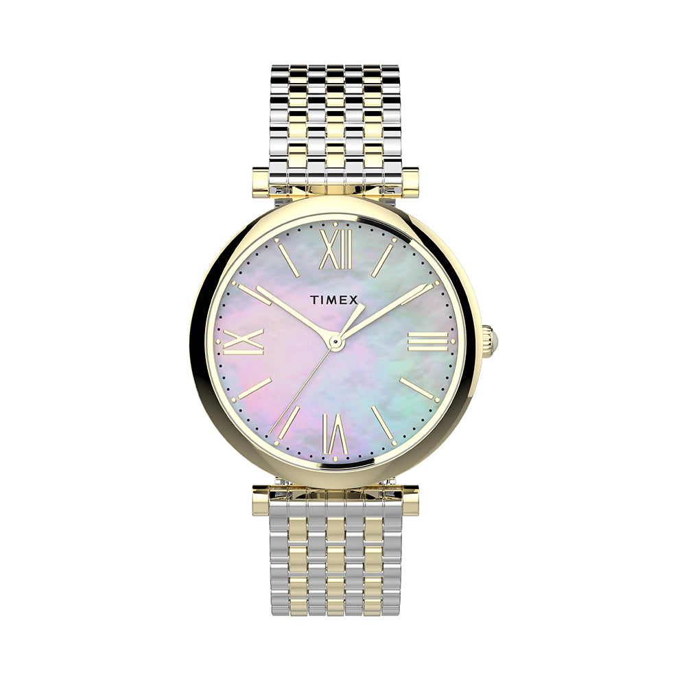 Our Parisienne collection finds appeal in its graceful design. Its gold-tone case and two-tone stainless steel quick-release bracelet come together with soft feminine details for an elevated look—including its mother-of-pearl dial, cabochon crown and floating lugs.