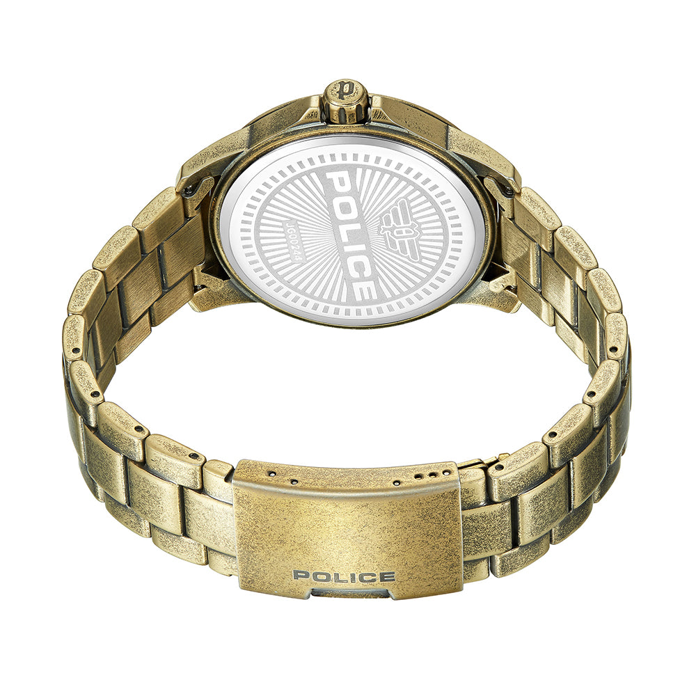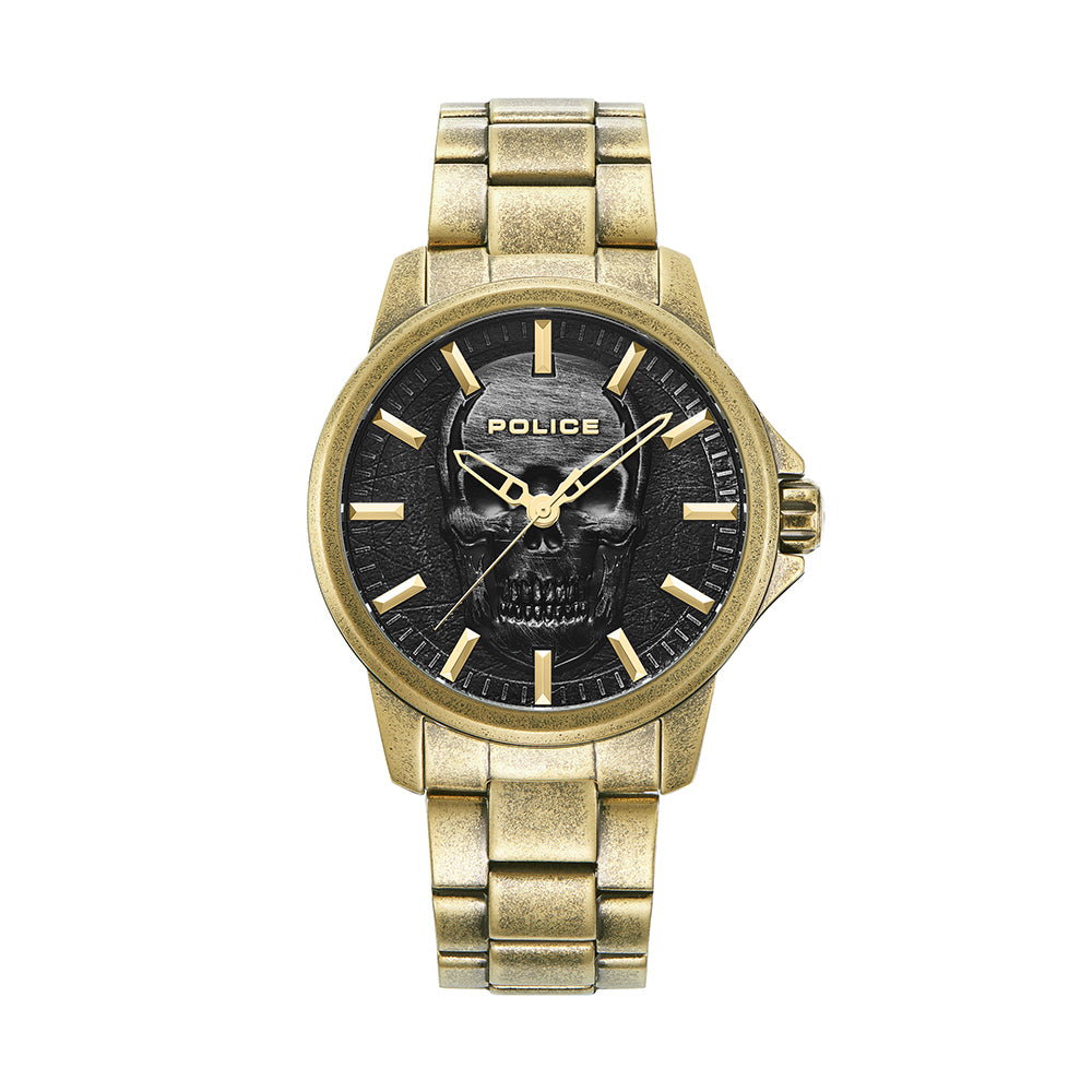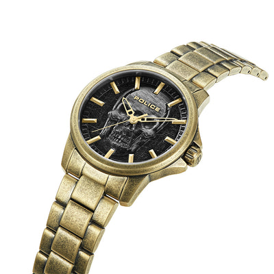 The Police men's Mensor - where individuality is affirmed, and self-expression is celebrated. Styled for the modern era fused with retro vibe, Mensor is for those looking for rugged finishing without compromising on style. The skull motif on the antique black dial adds a daring character to the overall design.