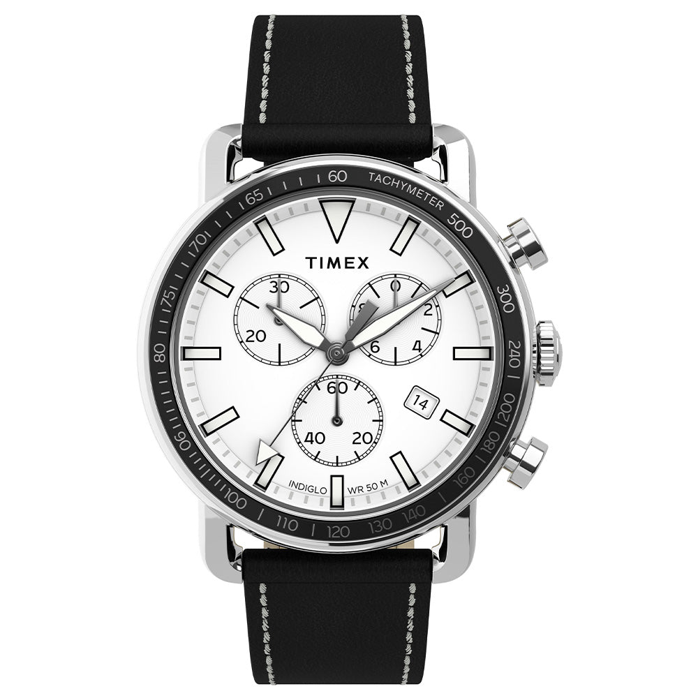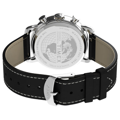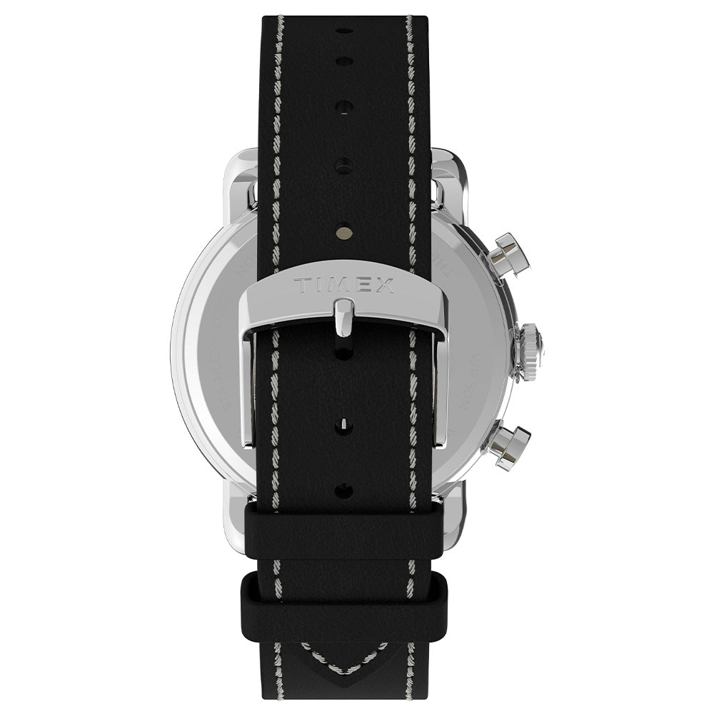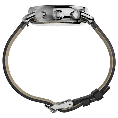 Inspired by sturdy metal boat fittings and navigational instruments, our Port Chronograph collection brings seafaring elements to watchmaking. The 42mm stainless steel case is sealed to resist water at pressures up to 100 meters. A black stitched natural leather strap attaches with non-traditional stirrup lugs to create a maritime watch rooted in utilitarian American design.