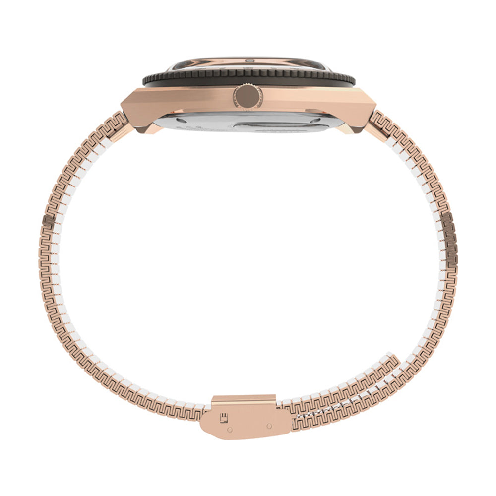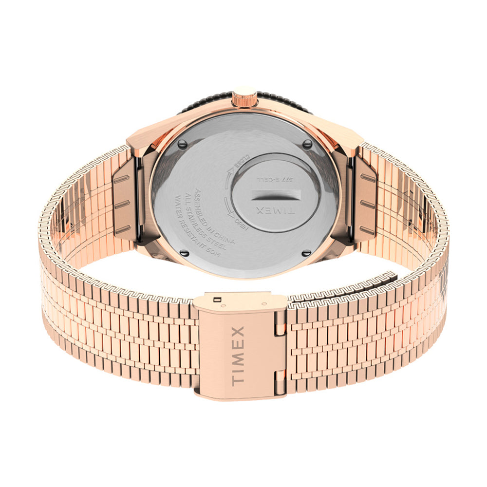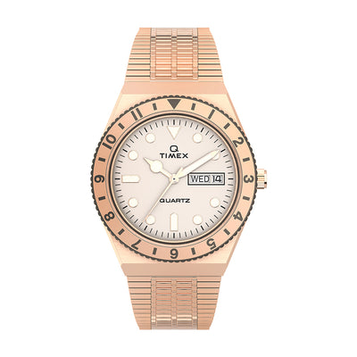 Perfect for everyday wear with a chic, neutral color palette. Inspired by our archival Q Timex designs from the age of Quartz, we stayed true the original details – including a rose gold-tone rotating bezel, functional battery hatch and domed acrylic crystal. The 36mm rose gold-tone stainless-steel case is paired with a cream dial and a comfortable woven rose gold-tone stainless-steel strap, easily adjustable for a look and fit you’ll love.