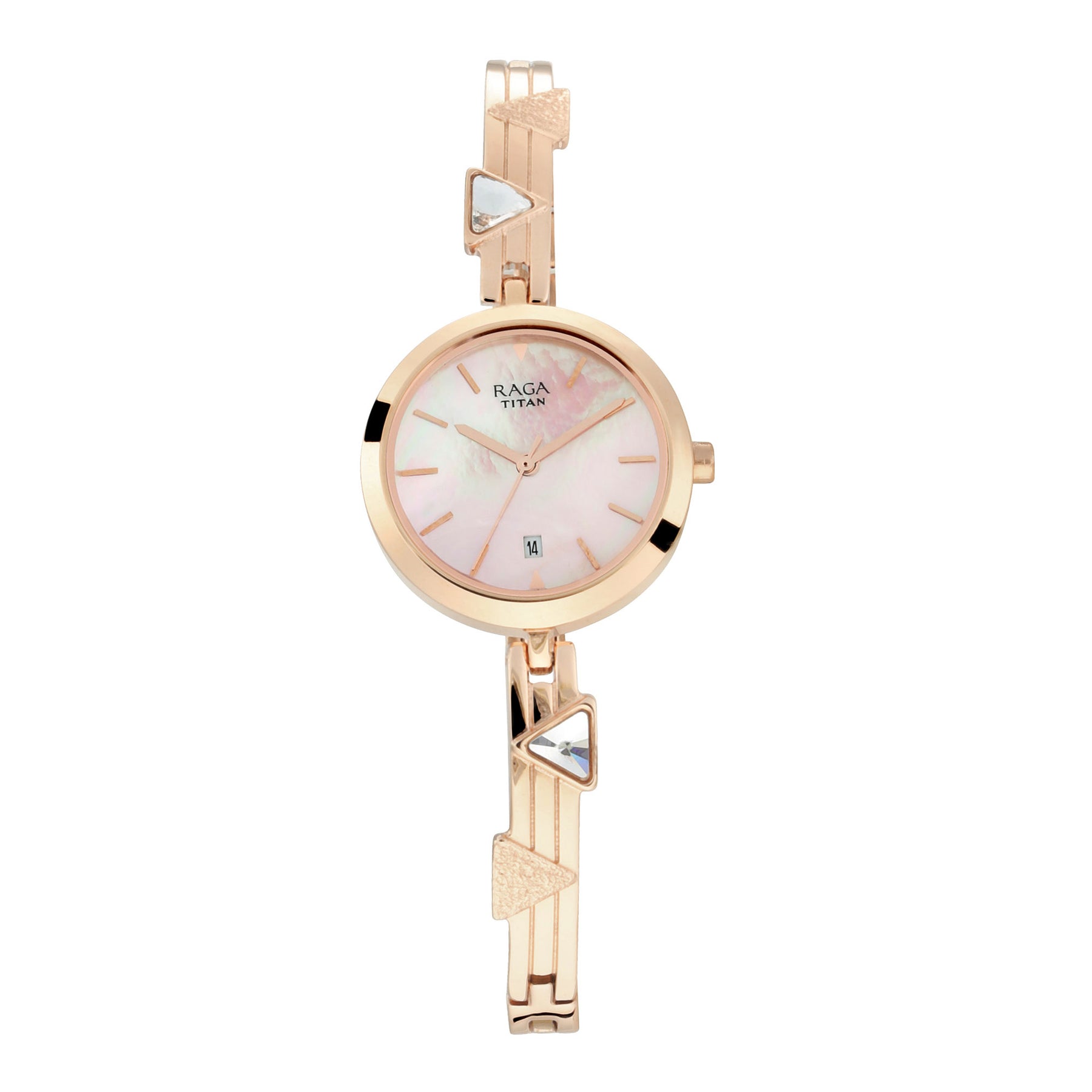 What makes our Raga sophisticated and elegant? The alluring swarovski crystal studded strap with pink mother of pearl dial that comes with a date display.