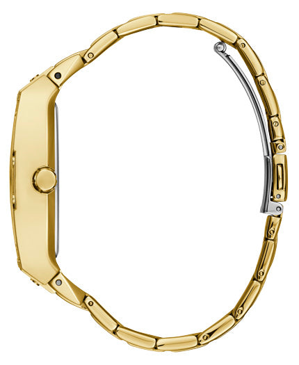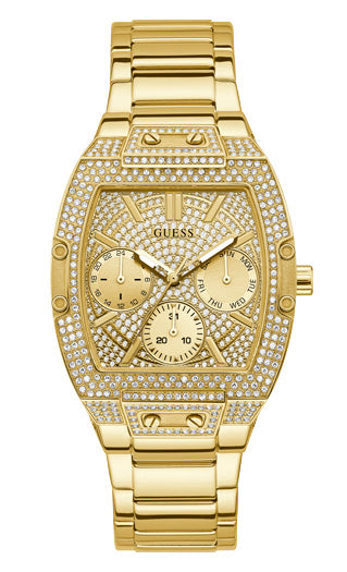Bring on the bling with this shimmering timepiece! Boasting 322 crystals on a barrel shaped case and a fully glitz multi-function dial, on a gold-tone stainless steel bracelet.