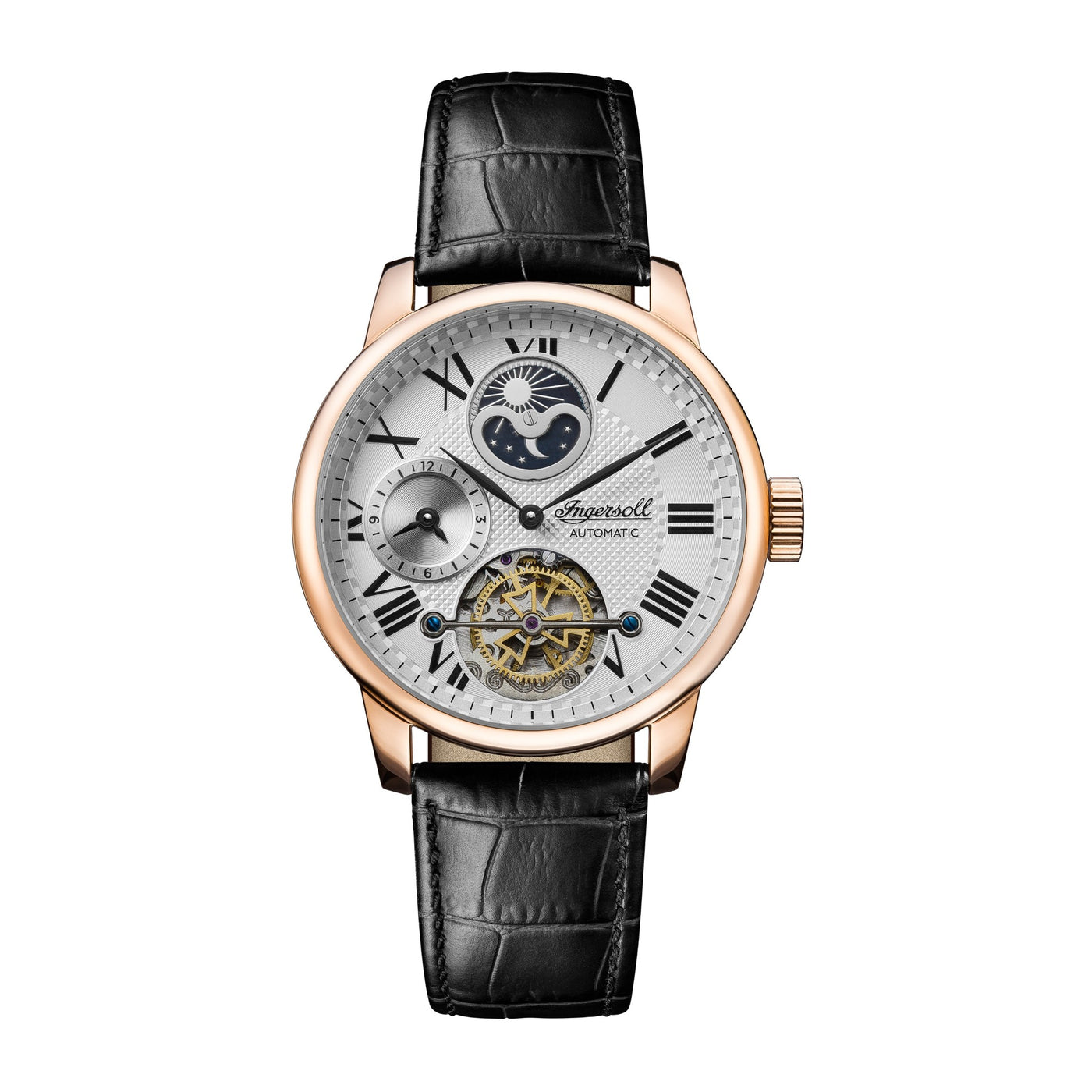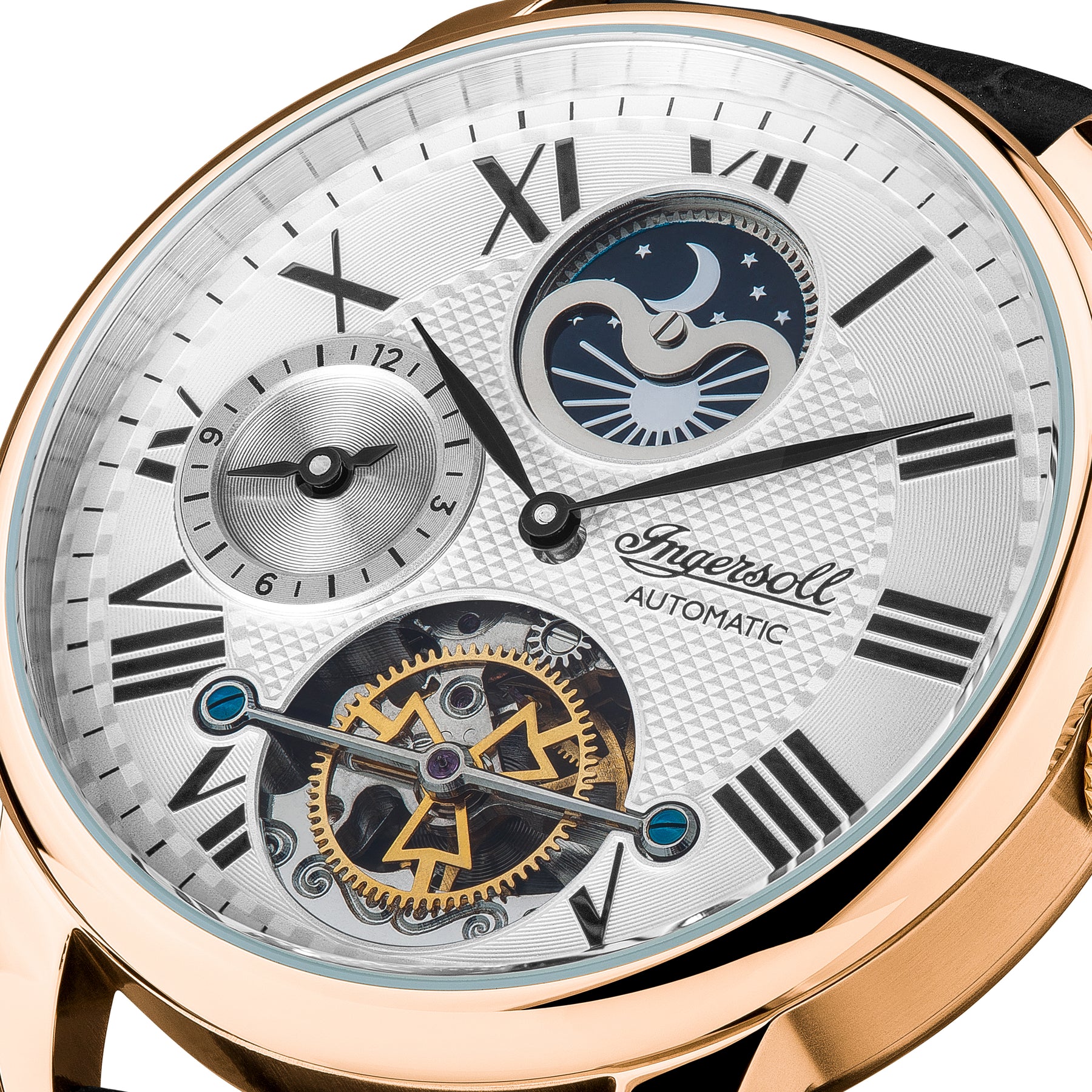 A classically inspired timepiece with the hallmark Ingersoll open heart movement, allowing the full balance wheel and its accompanying decorative architecture to be appreciated in full. The unmistakeable elegance of the Roman numeral dial creates a heightened harmony between the ornate dial detailing and the romance presented by the moon phase.