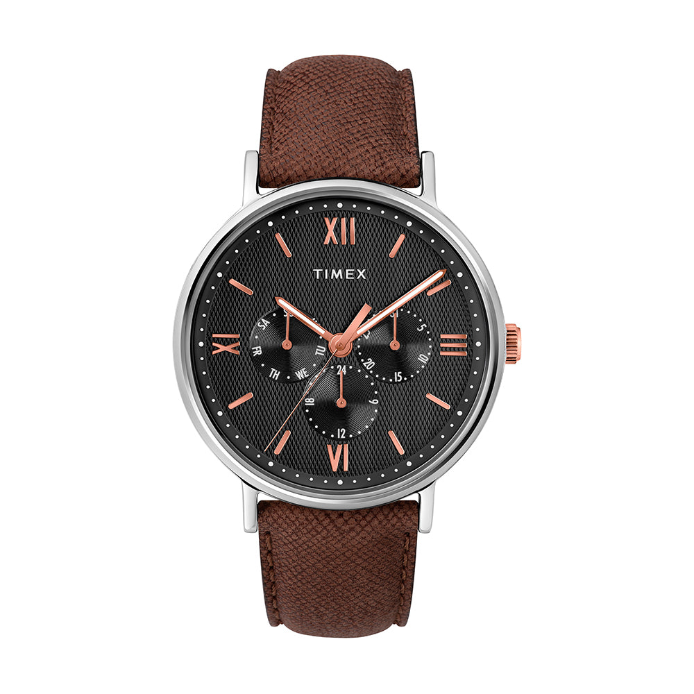 We combined premium style with the precision craftsmanship you have come to expect from Timex. The black multifunction dial and silver-tone case paired with a brown leather strap gives you a distinguished look you can wear from day to night.