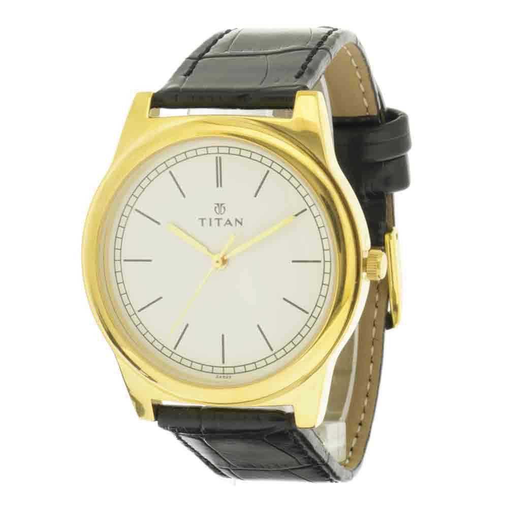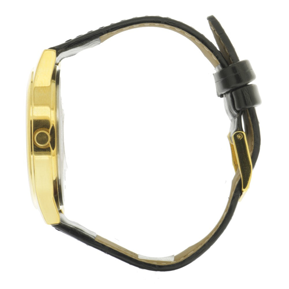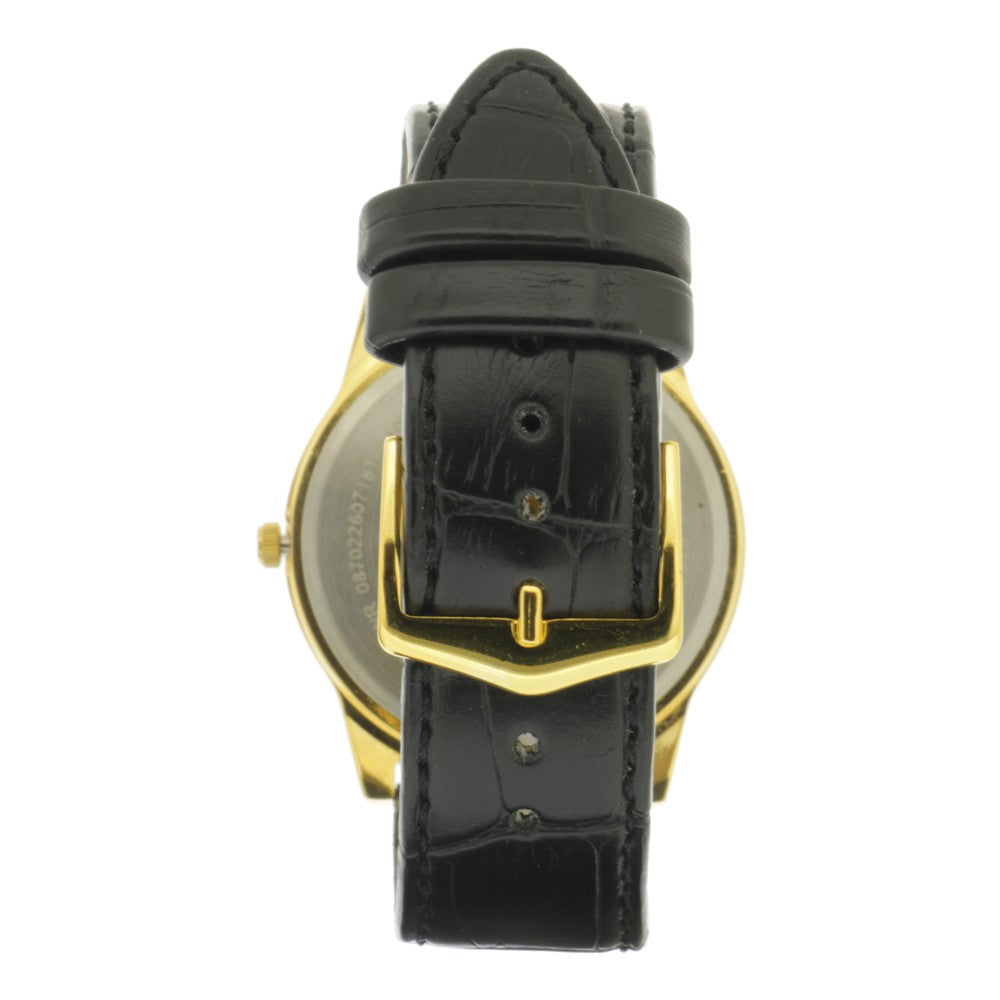 Enclosed with gold case, this white dial black leather strap watch will complete your office wear. Bring your A game to that professional look!