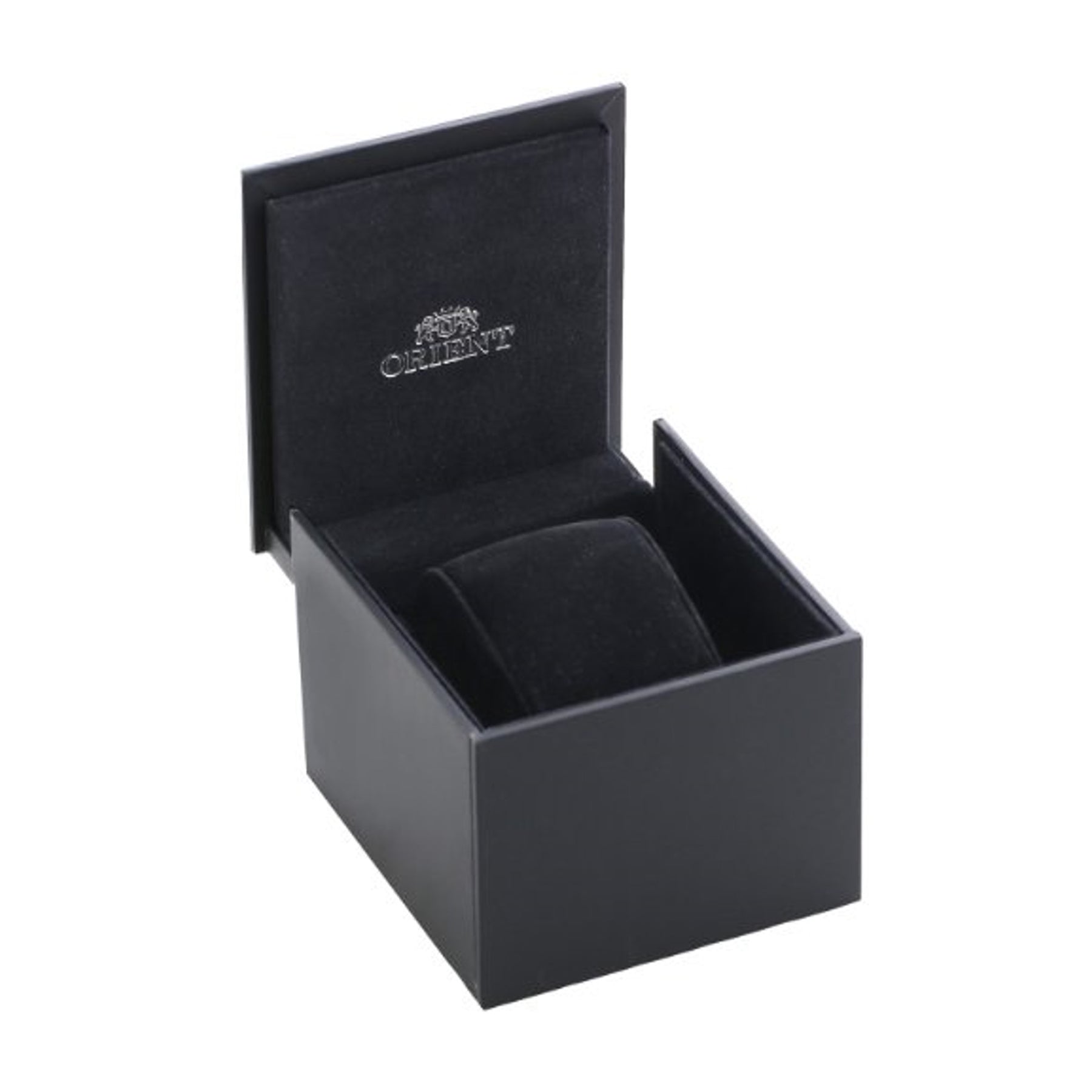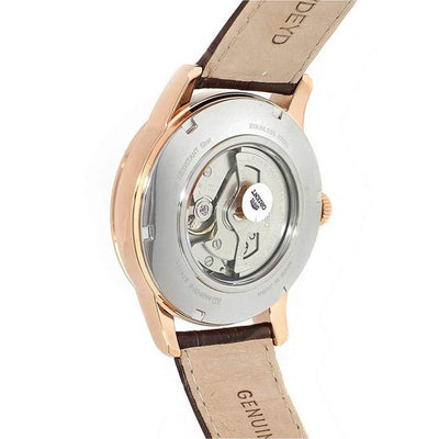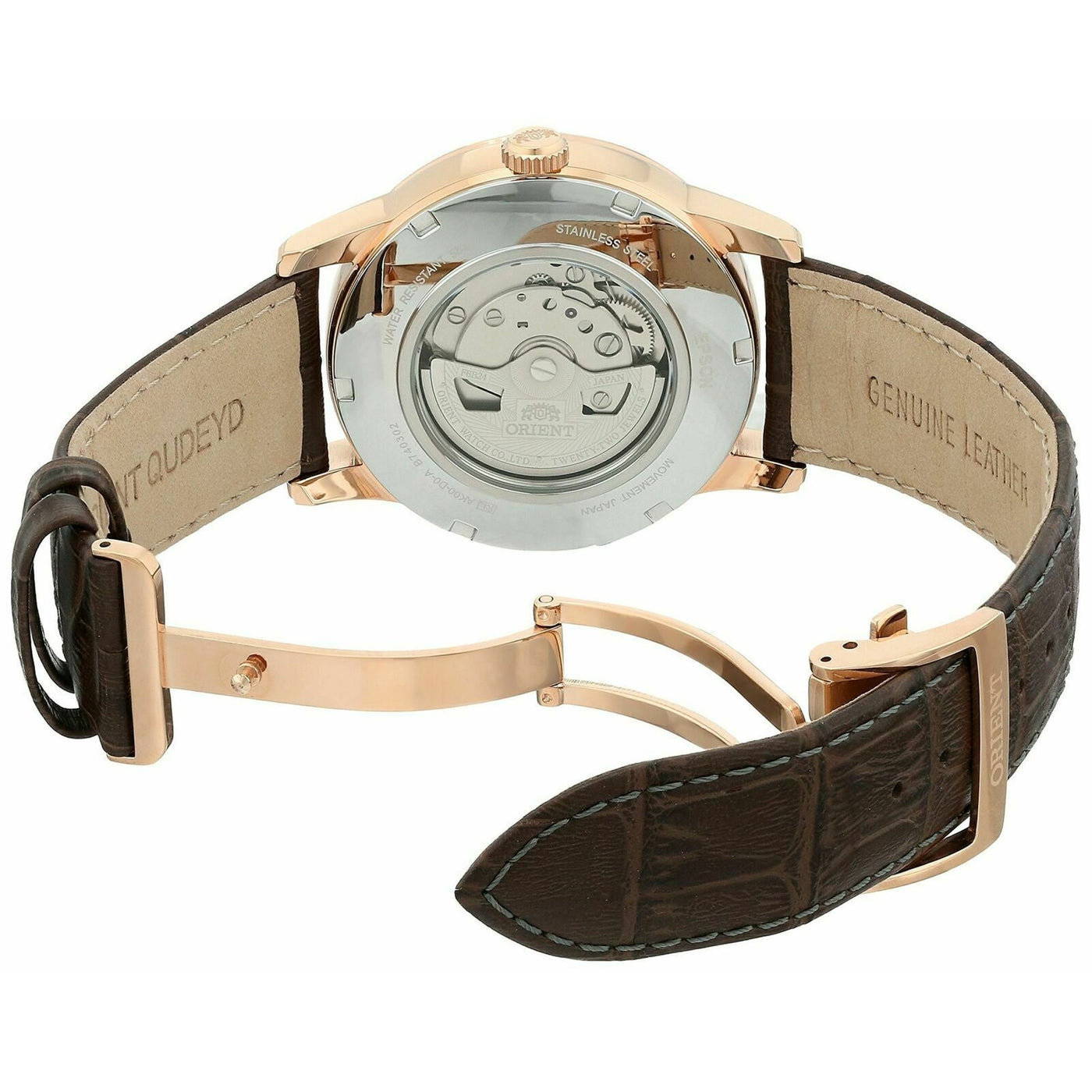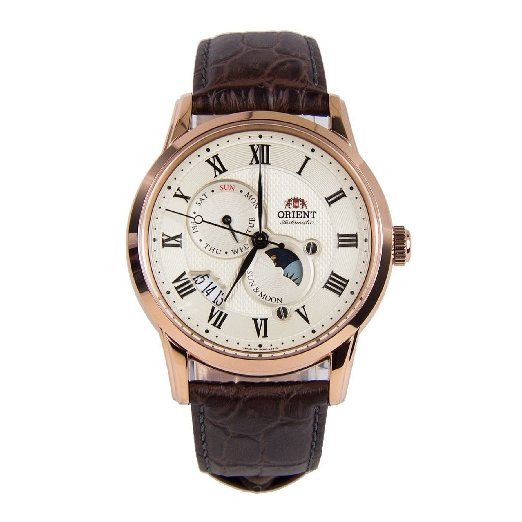 This classic Orient 43mm mechanical watch showcases a rose gold stainless steel case and crocodile textured band with a stylish champagne dial. Complementing its sophisticated design are attractive black hands and roman numeral hour markers, individual apertures for date, day, and sun and moon tracking.