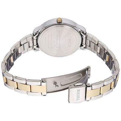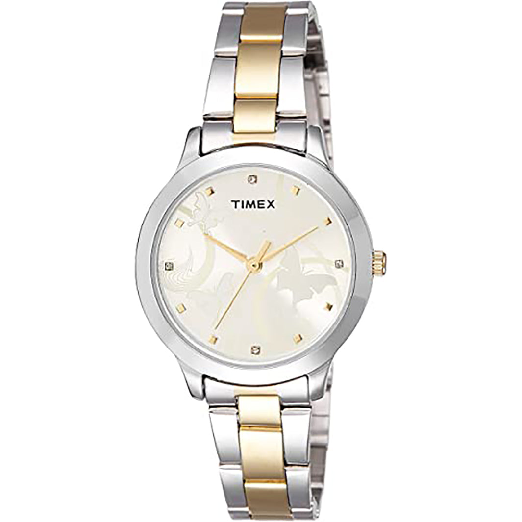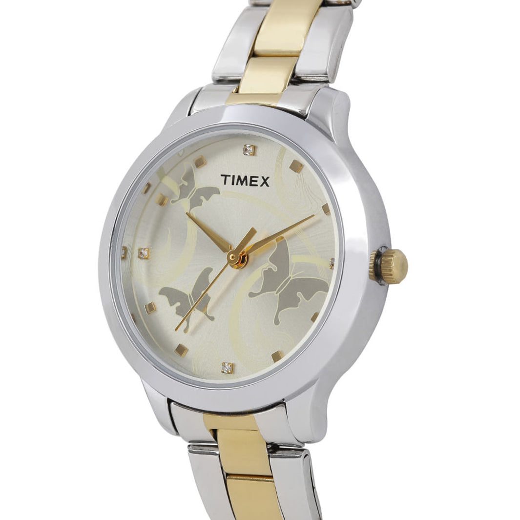 Enhance your style quotient by wearing this women's analog watch from Timex. Its stainless steel strap exudes combined shades of silver and gold that accentuate the look of the watch. Operated by a quartz movement, the silver round dial showcases plain three hands, hour markings at five-minute intervals, butterfly motifs and a crown for time adjustment.