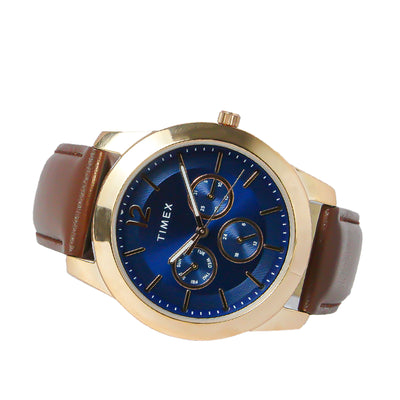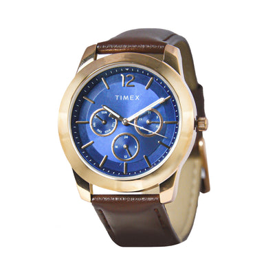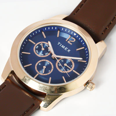 A casual way to wear a classic watch, the careful attention to detail especially on the multifunction blue dial enclosed in a rose gold tone case allows these watch to shine as some of our most refined everyday timepieces.