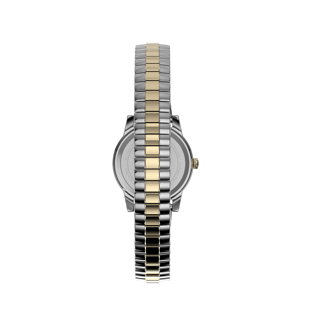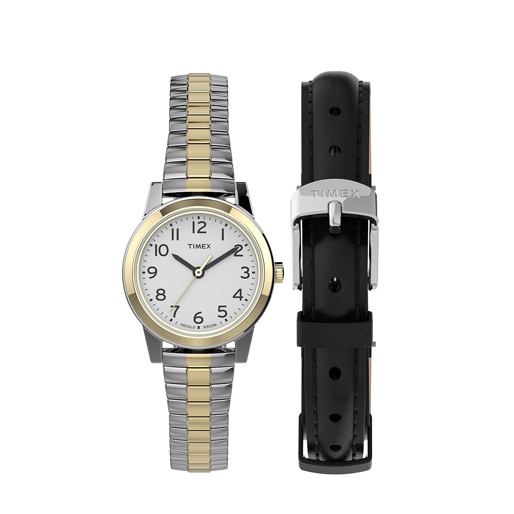 IT TAKES A LICKING AND KEEPS ON TICKING®. A classic feminine approach to our favorite watch makes for an elegant modern timepiece. The two-tone 26mm case and two-tone expansion band or additional black leather strap provide multiple styling options that can enhance any look.