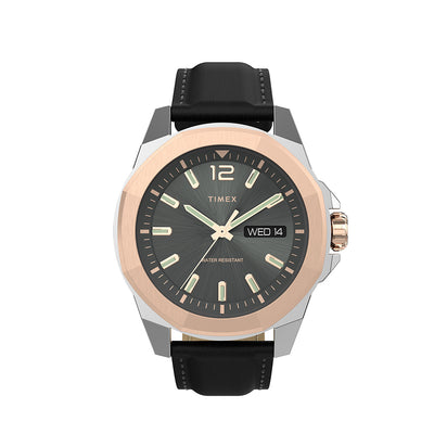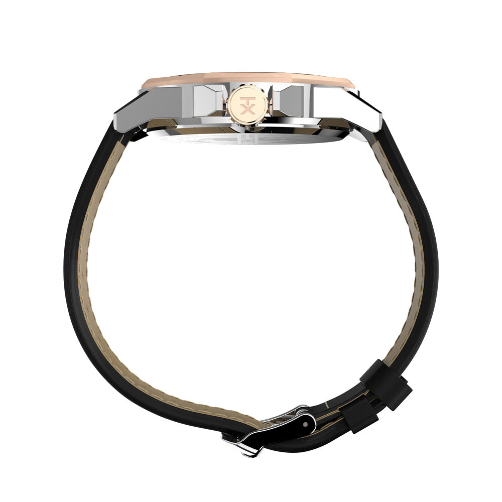 Our legendary durability comes to life with this modern analog watch. The octagonal bezel top is the standout of this two-piece case, while the crown protector, refined brushed finish, and oversized 44mm diameter complete its bold yet sophisticated look. Featuring an elegant black dial, this watch comes equipped with a date indicator, black leather strap, and striking case in both rose gold-tone and silver-tone for a look you'll love.