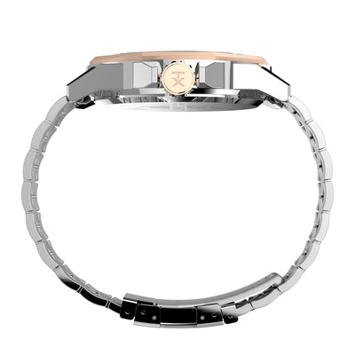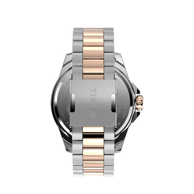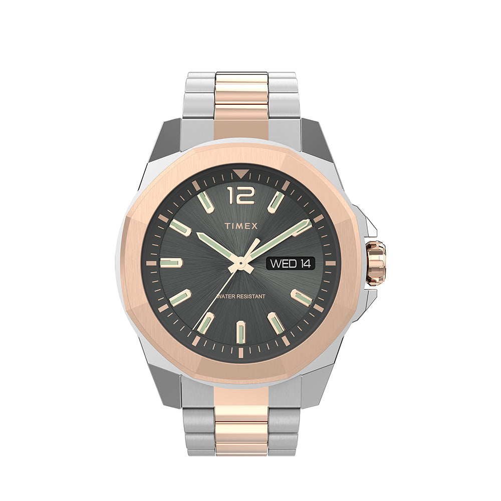 Our legendary durability comes to life with this modern analog watch. the octagonal bezel top is the standout of this two-piece stainless-steel case, while the crown protector, refined brushed finish, and oversized 44mm diameter complete its bold yet sophisticated look. featuring an elegant black dial, this watch comes equipped with a date indicator and striking stainless-steel bracelet in both rose gold-tone and silver-tone for a look you'll love.