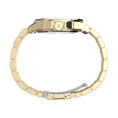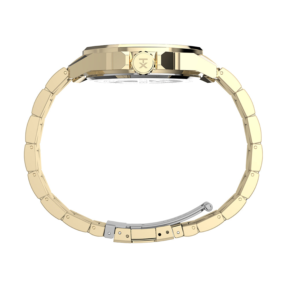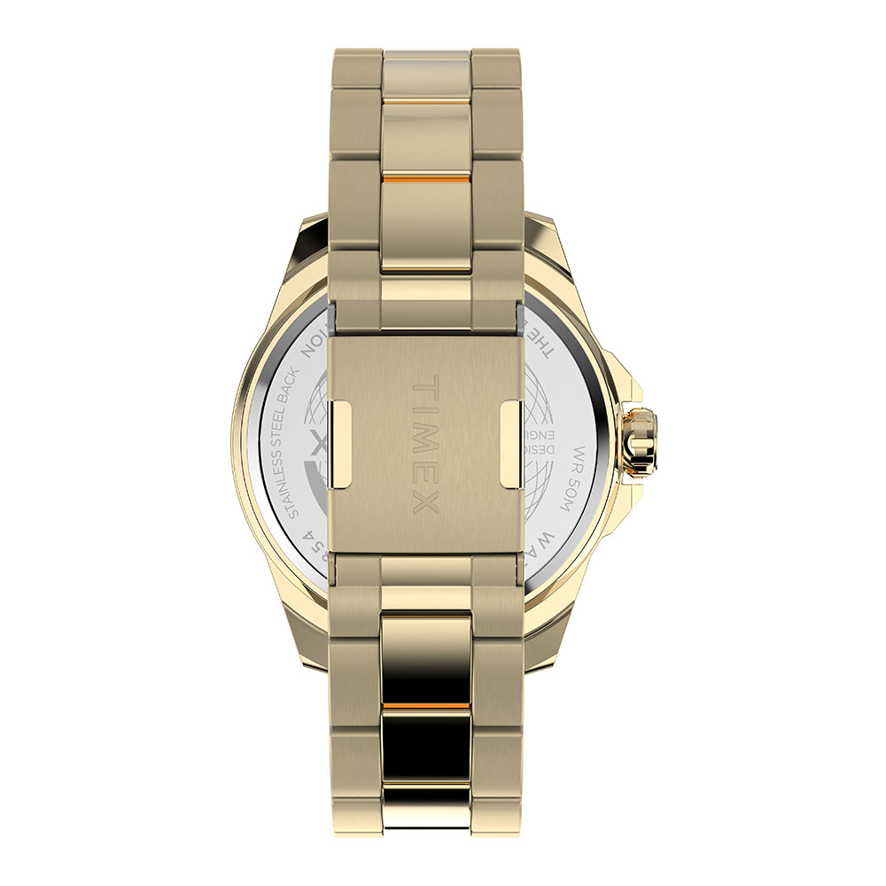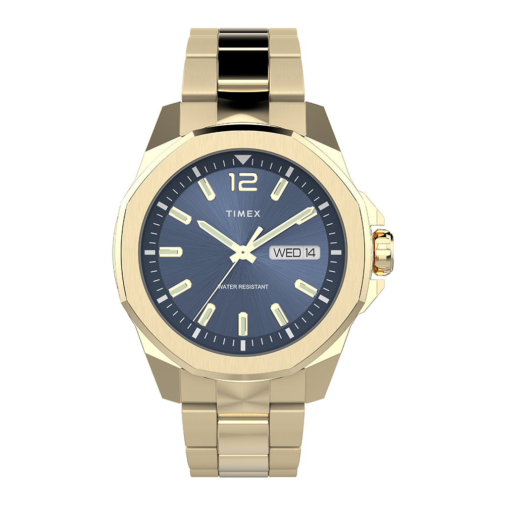 Our legendary durability comes to life with this modern analog watch. The octagonal bezel top is the standout of this two-piece case, while the crown protector, refined vertical brushed finish, and oversized 46mm diameter complete its bold yet sophisticated look. Featuring a deep blue sunray dial, this watch comes equipped with a day and date indicator and a gold-tone stainless-steel bracelet.