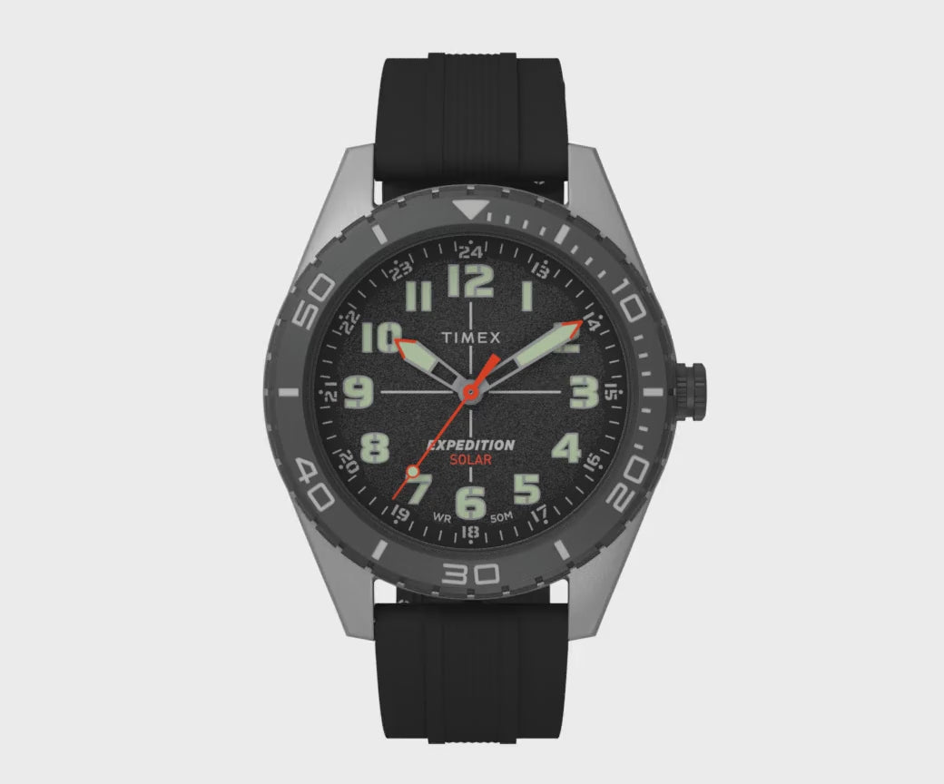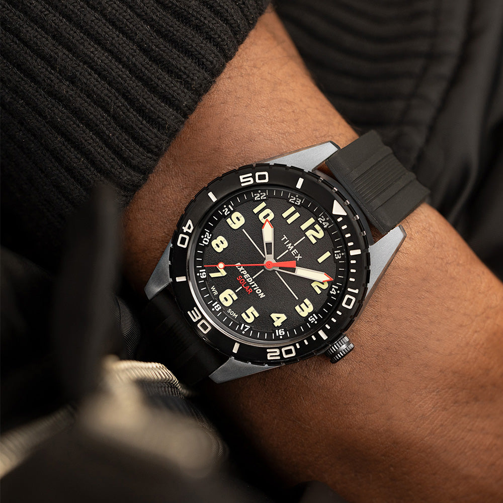 Featuring a Japanese solar-powered movement that lasts up to 4 months and eliminates the need for battery changes, our Expedition® Field Solar is a military-inspired outdoor watch made to accompany you anywhere. It also boasts a rugged two-piece 43mm metal case, 50m water resistance rating, and a soft, black silicone strap. And thanks to the luminescent hands and dial markings, the sun works overtime to make this watch legible in the dark.