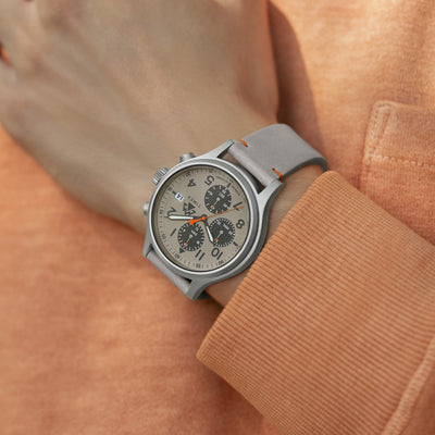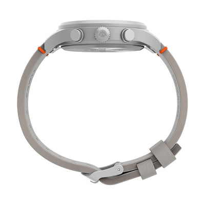 Built for the planet-conscious adventurer, the Expedition North® Sierra Chronograph features a slightly tapered, vegan leather strap crafted with bio-based resin that uses corn polyols. The silver-grey dial offers a unique look with the sub-dials sitting at 12, 9, and 6, and the bright orange second hand provides a striking color contrast. This watch is also equipped with a 42mm silver-tone brass case, luminescent hands, 100m of water resistance, and a date window; all necessary features when you?re going off the grid.