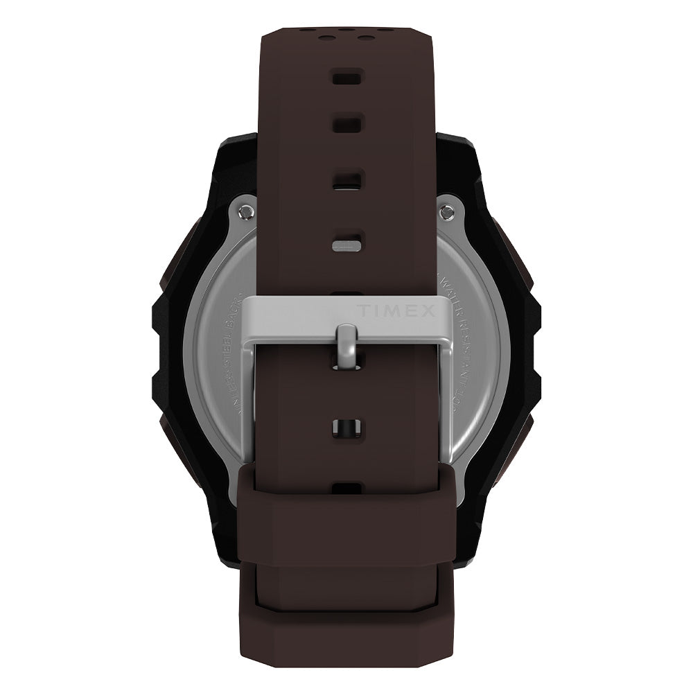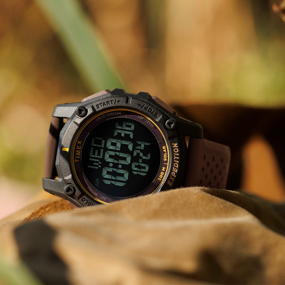 Experience the ultimate in outdoor functionality. This digital outdoor watch is equipped with a solar battery that’s charged by any light source, featuring a battery icon for easy monitoring and a power-saving function. Designed to keep up with your adventures, it’s built with a durable 49mm resin case and includes a 1/100th second chronograph, three daily alarms, a 24-hour countdown timer, our INDIGLO® backlight for night visibility, 100m of water resistance, and a world time feature tracking 50 cities across the globe. Pair it with a brown textured silicone strap for all-day comfort.