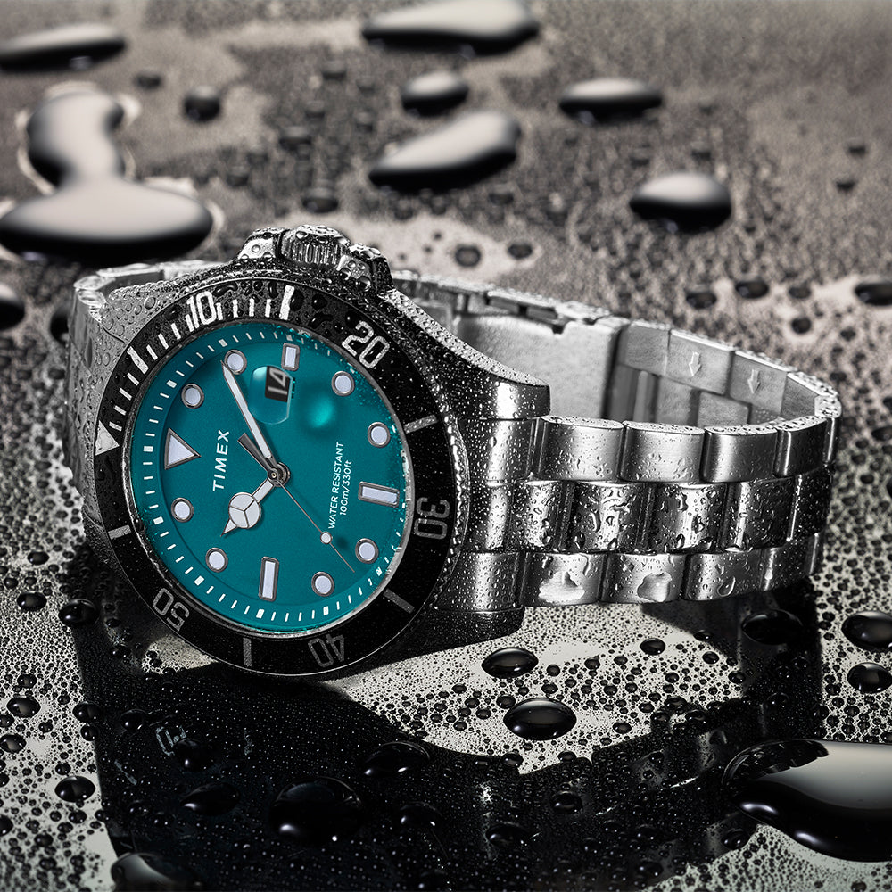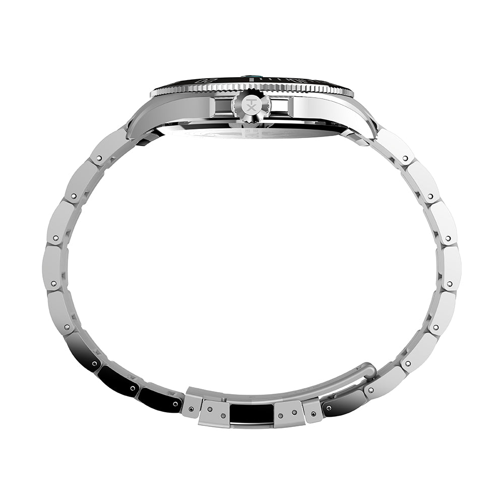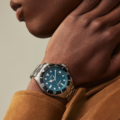 Our Harborside Coast has an elevated look meticulously designed with nautical influence at the helm. Featuring a 43mm silver-tone case, this diver-inspired, polished-yet-rugged watch stands out on the wrist with a stainless-steel bracelet with quick release spring bars. Complete with 100m of water resistance, a rotating bezel, and a beautiful aventurine-colored dial reminiscent of the sea, the Harborside Coast is ready to set sail.