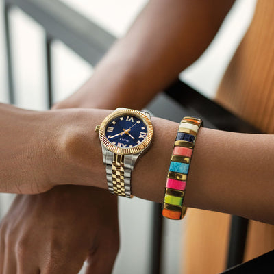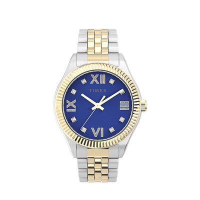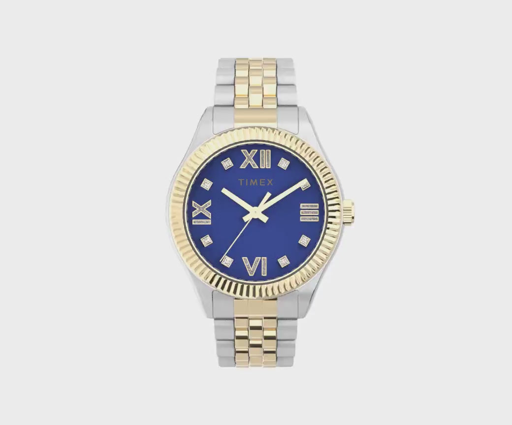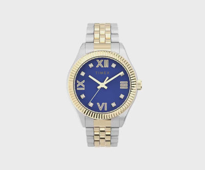 A fresh take on a traditional watch, the Legacy never fails to find new ways of telling our story. This thoughtfully crafted timepiece features a two-tone 34mm stainless-steel case and bracelet with a time-honored design and up-to-the-minute color palette by way of its rich, jewel-toned blue dial. A testament to our heritage and well-suited for everyday wear, its gorgeous crystal accents, Roman numeral markers, and elegant, fluted bezel prove you don?t have to sacrifice beauty for strength.