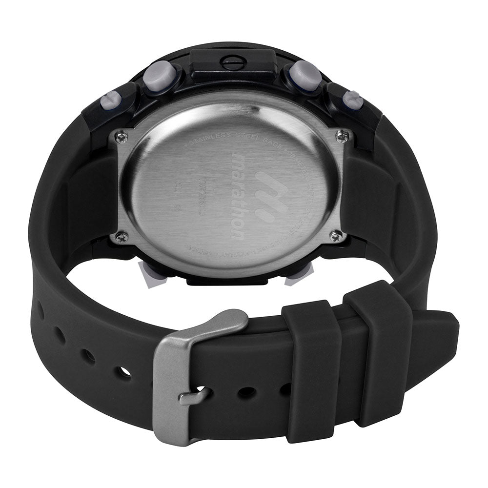 Every day is a marathon. you can rely on this gray digital sport watch with blue and black accents that features a comfortable resin strap, 24-hour stopwatch, daily alarms and indigloã?â® night-light that is water resistant up to 30 meters.