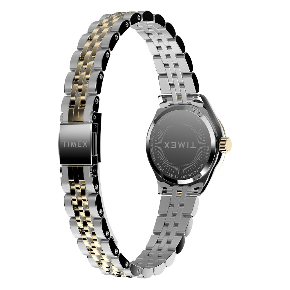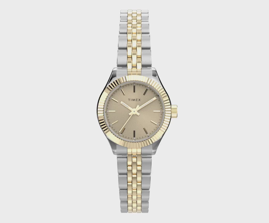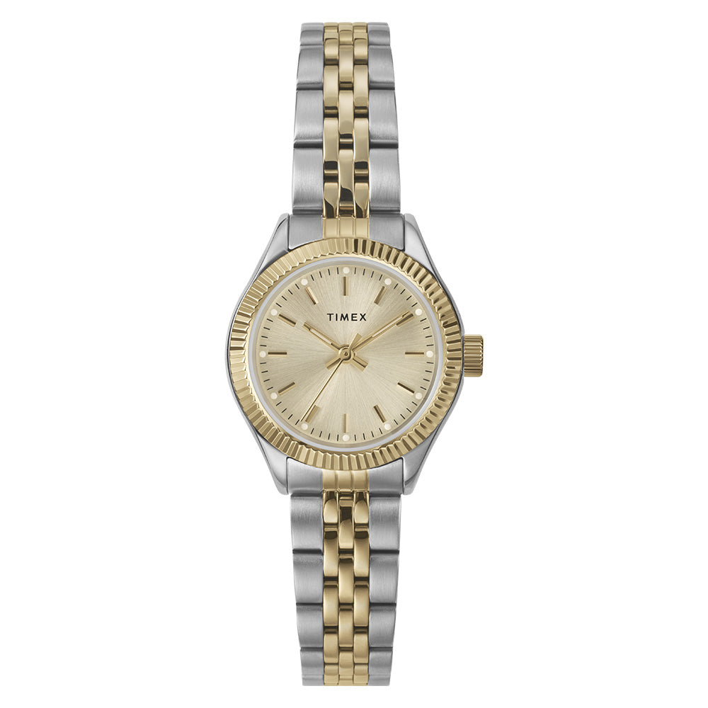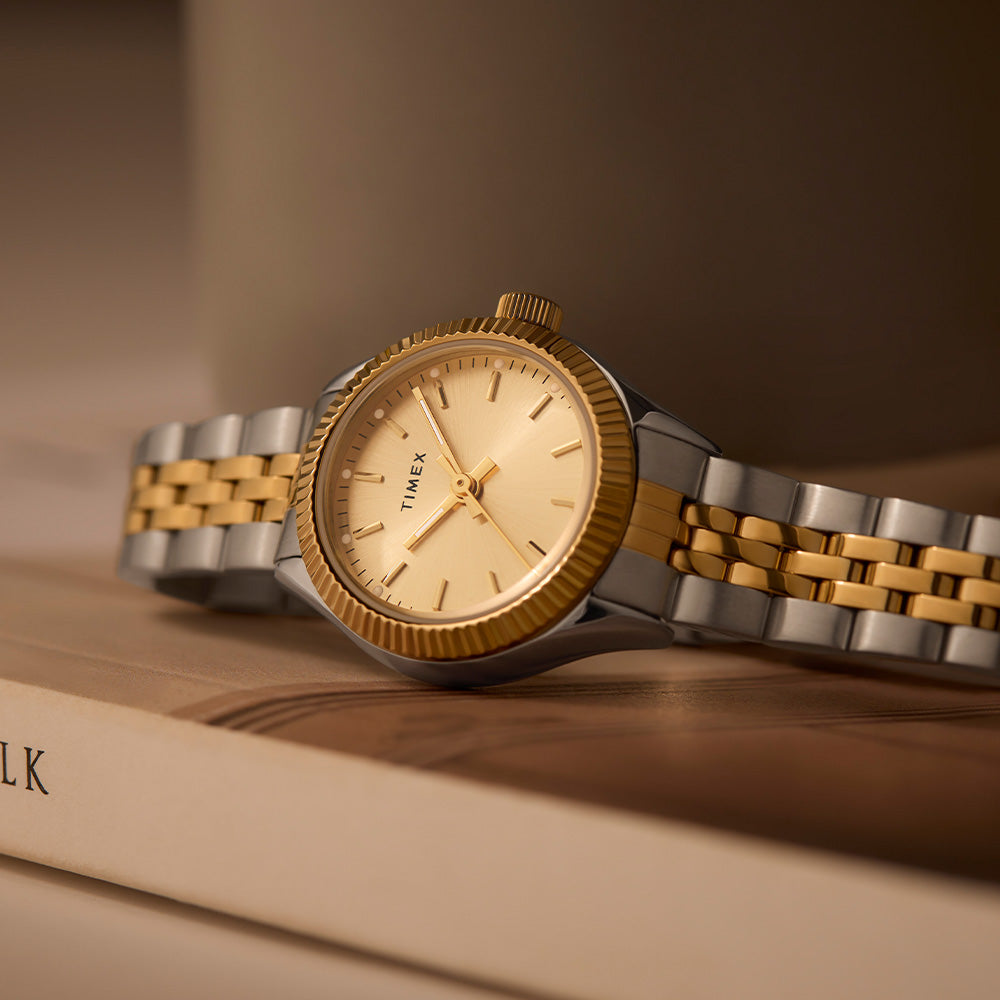 Following recent trends in petite watches, we’ve refined our Women’s Timex Legacy with a smaller polished 25mm case. The sunray dial appears in a delicate shade of gold, highlighted by applied indices and perfectly encircled by an elegantly fluted bezel. We’ve paired this stylish mini with a shining brushed and polished two-tone stainless-steel bracelet.