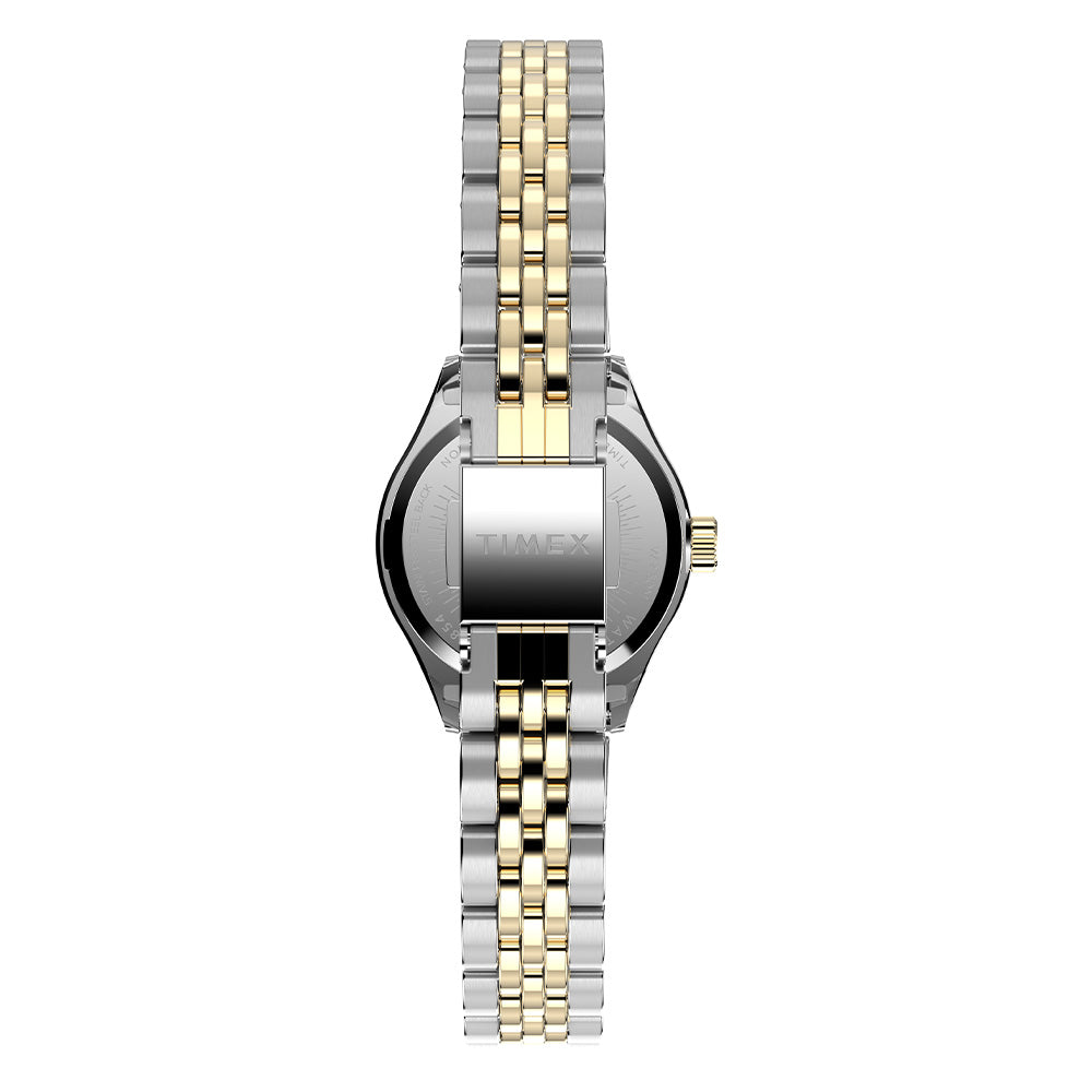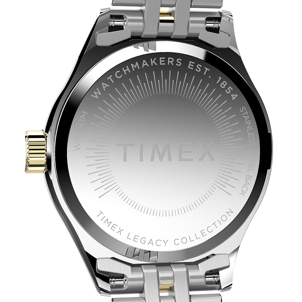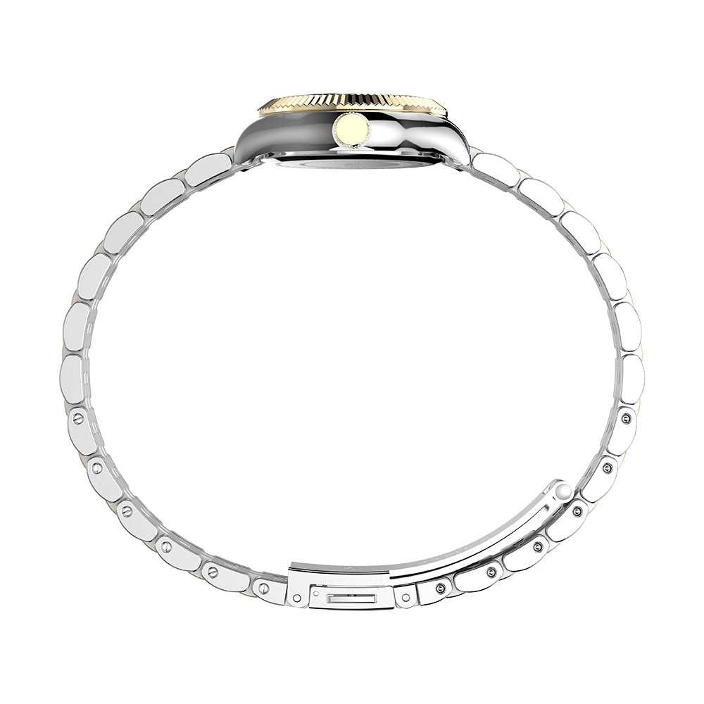 Following recent trends in petite watches, we’ve refined our Women’s Timex Legacy with a smaller polished 25mm case. The sunray dial appears in a delicate shade of gold, highlighted by applied indices and perfectly encircled by an elegantly fluted bezel. We’ve paired this stylish mini with a shining brushed and polished two-tone stainless-steel bracelet.
