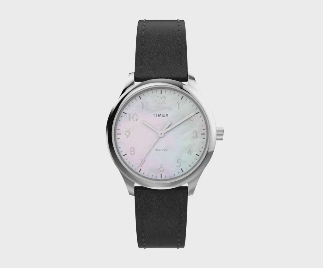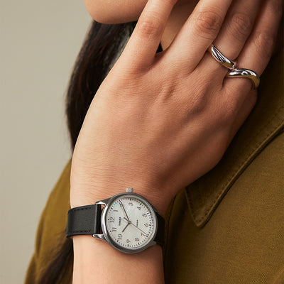We took a modern approach to our classic 1977 watch with updates to its 32mm silver-tone case, lustrous mother-of-pearl dial, and black natural leather strap?bringing together simplicity and effortless style. It's also equipped with an INDIGLO® backlight for nighttime visibility.