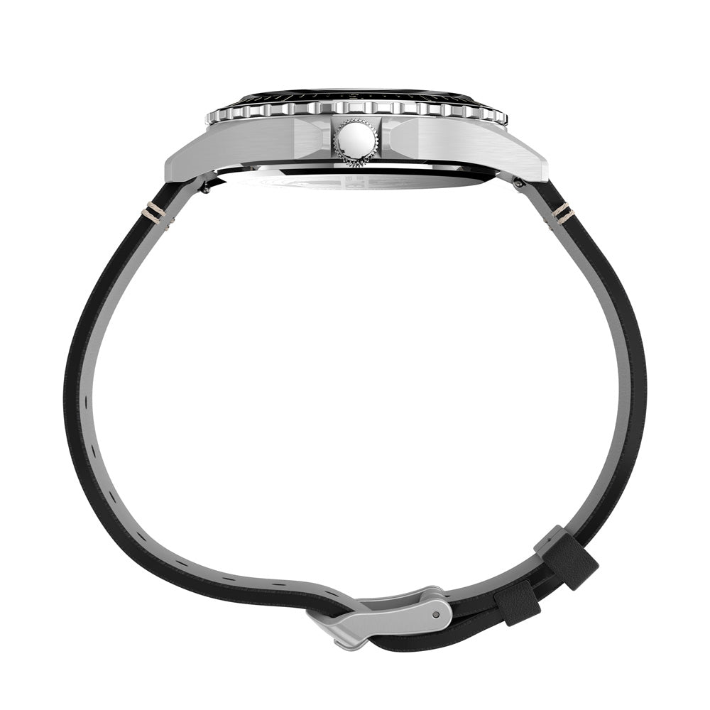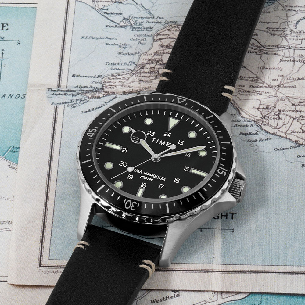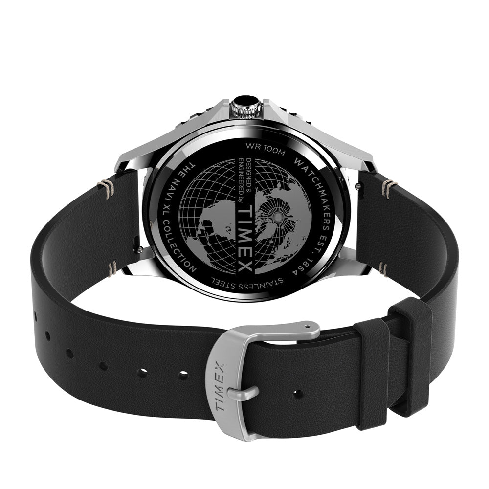The best inspiration is always found while searching our archives. Our Navi XL pulls its design influence from our earliest diver-style watches. The 43mm black stainless-steel case with a rotating top ring, black dial, and smooth, black natural leather strap with side stitching provides a modern take on this vintage design.
