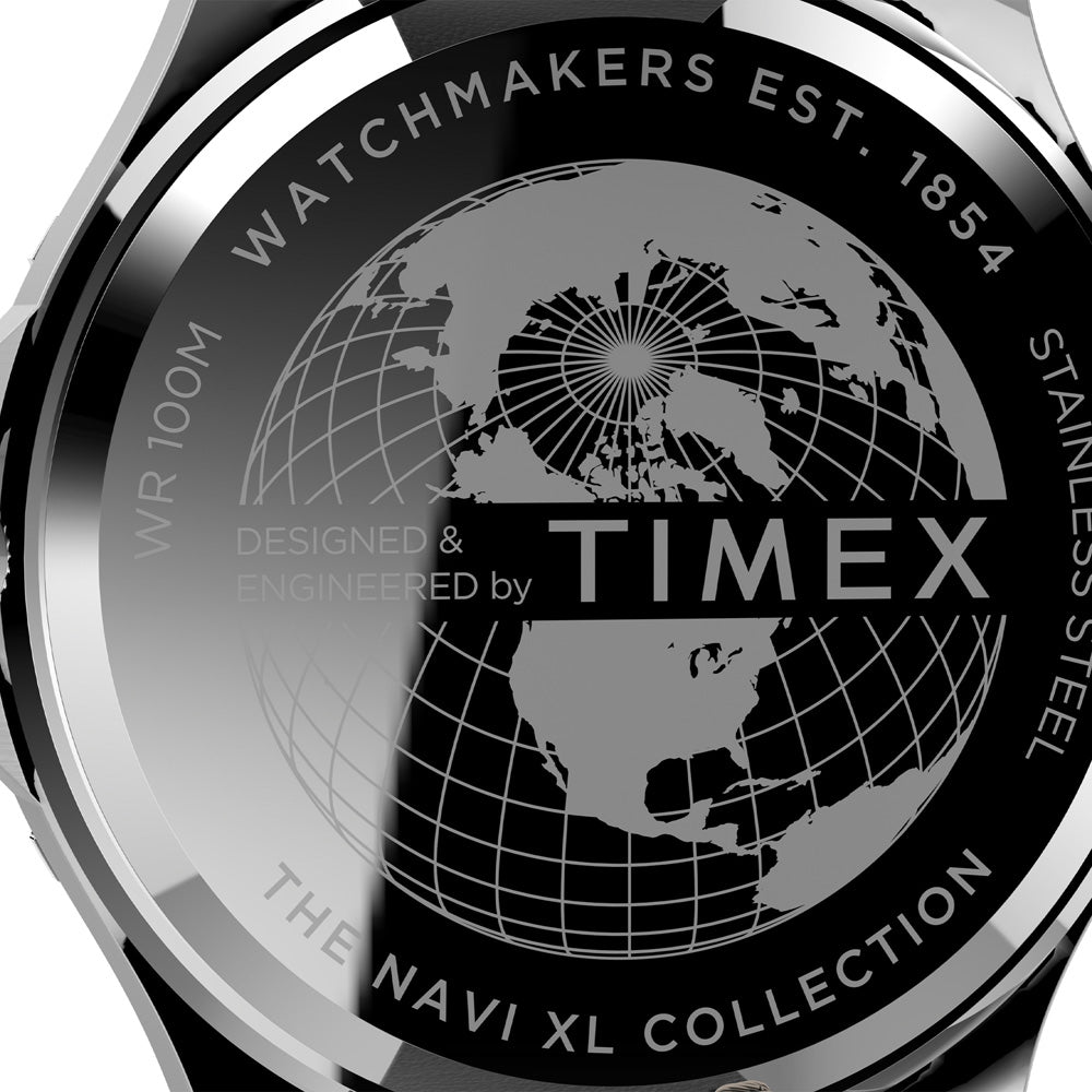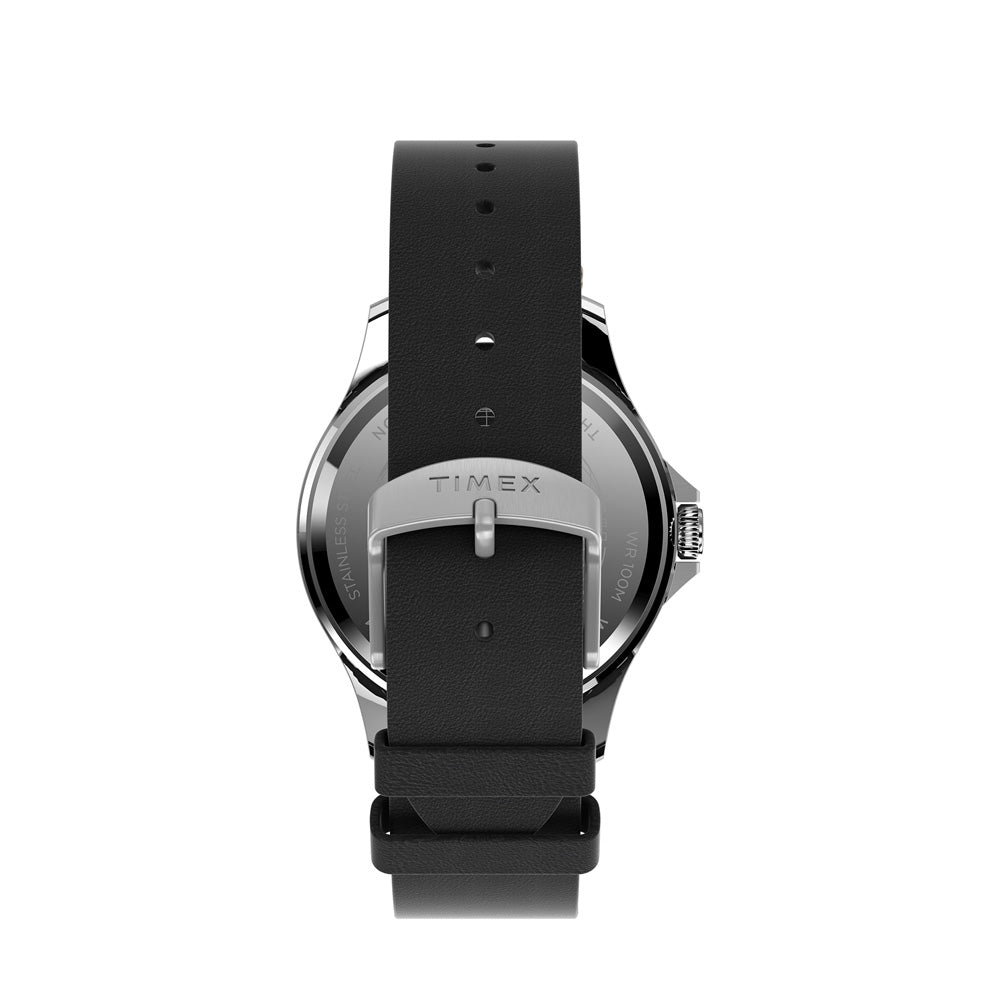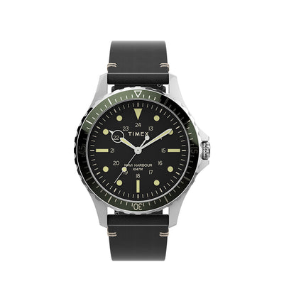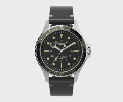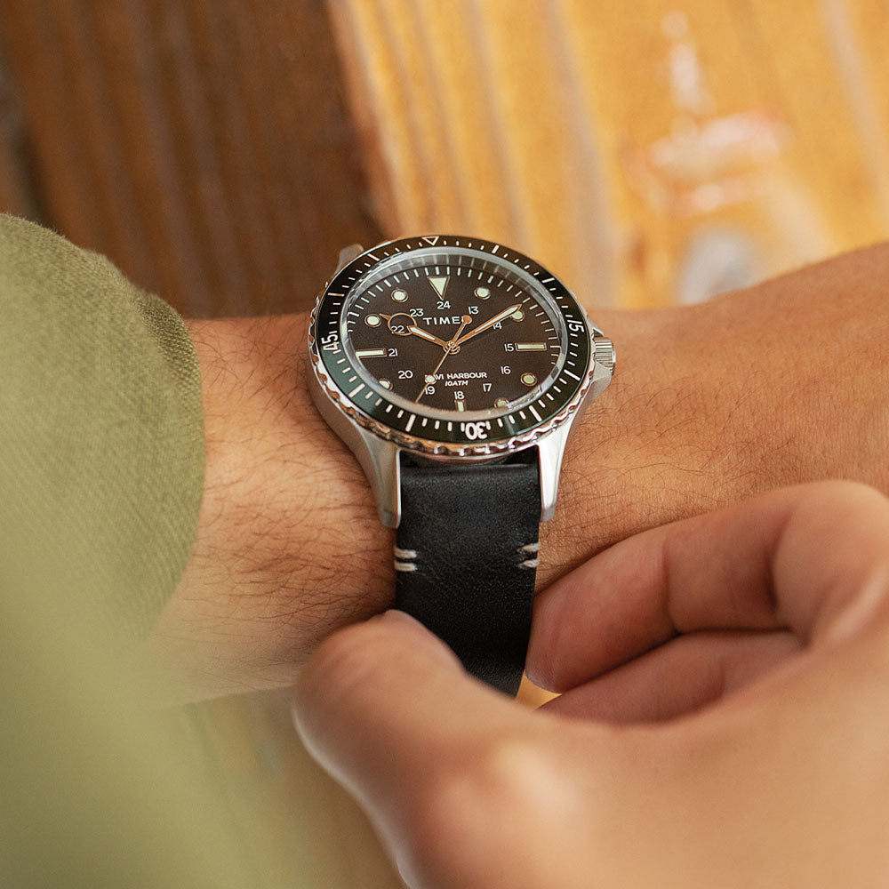 The best inspiration is always found while searching our archives. Our Navi XL pulls its design influence from our earliest diver-style watches. The 43mm black stainless-steel case with a rotating top ring, black dial, and smooth, black natural leather strap with side stitching provides a modern take on this vintage design.