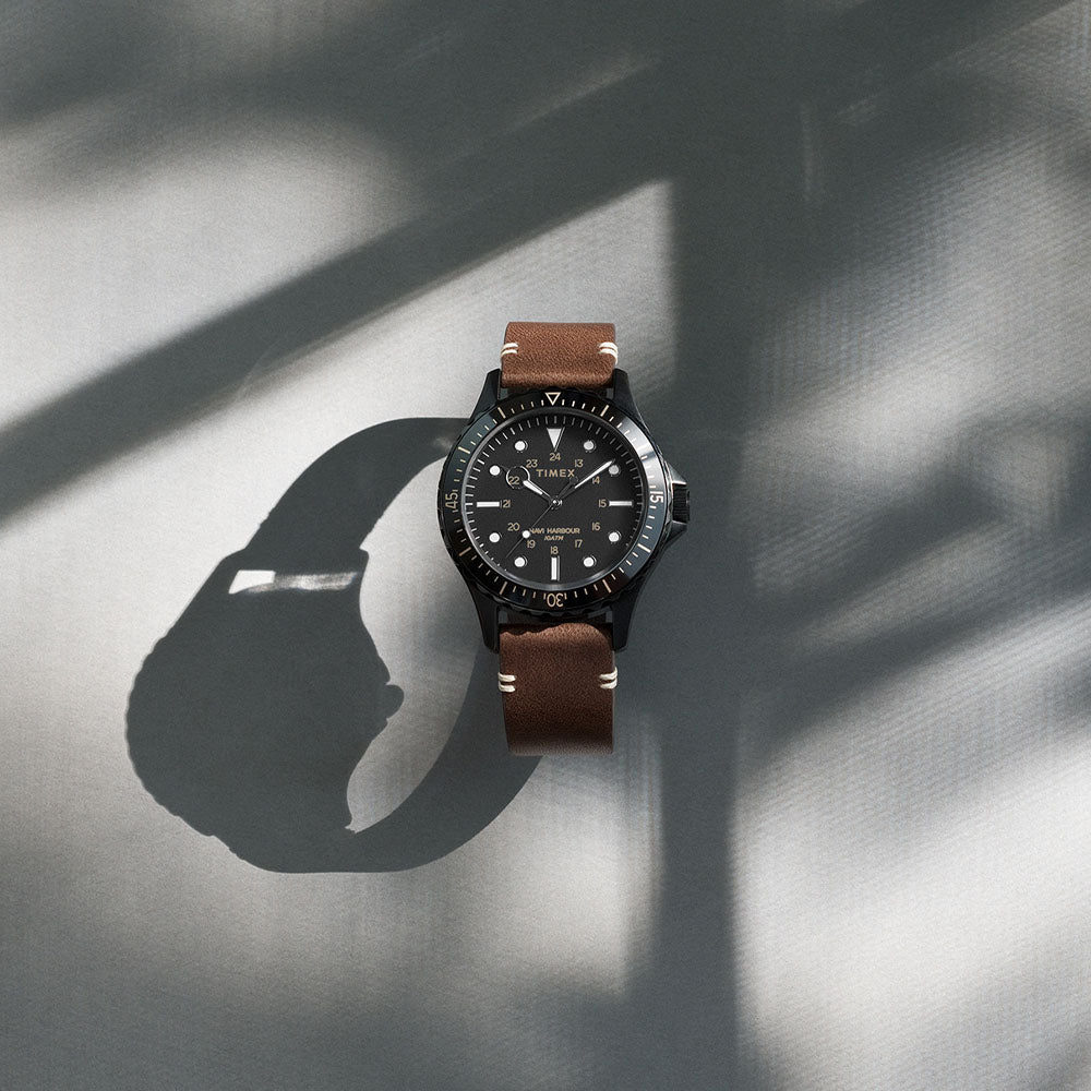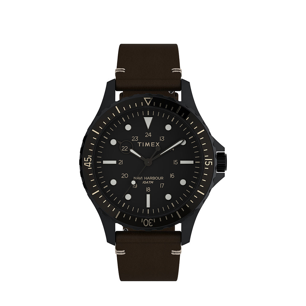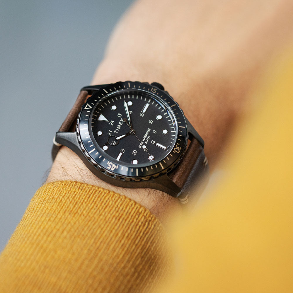 The best inspiration is always found while searching our archives. Our Navi XL pulls its design influence from our earliest diver-style watches. The 43mm black stainless-steel case with a rotating top ring, black dial, and smooth, brown natural leather strap with side stitching provides a modern take on this vintage design.