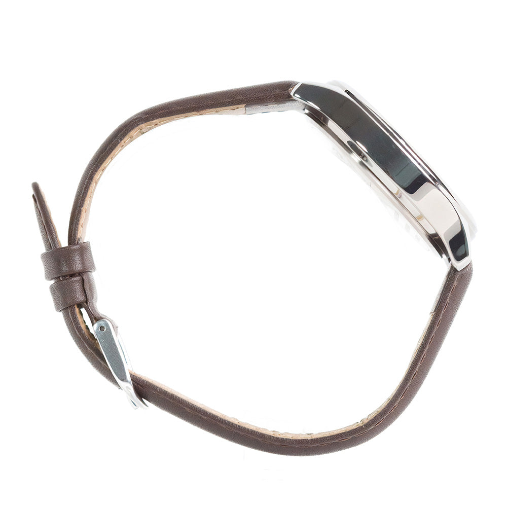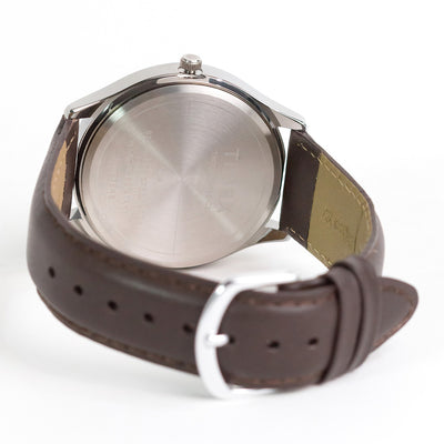 This classic analog watch for men features silver accent case and genuine brown leather strap. the functional design of the silver white dial highlighting arabic markers provides a classic and sophisticated display of the time. over-all, the stunning silver accents creates a perfect balance of elegance and simplicity, that will help exude confidence to every gentleman wearing it.