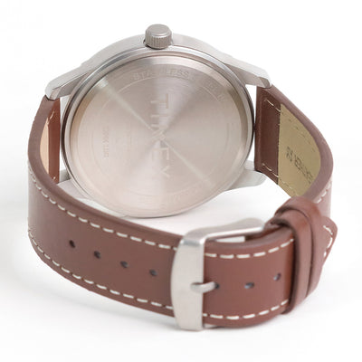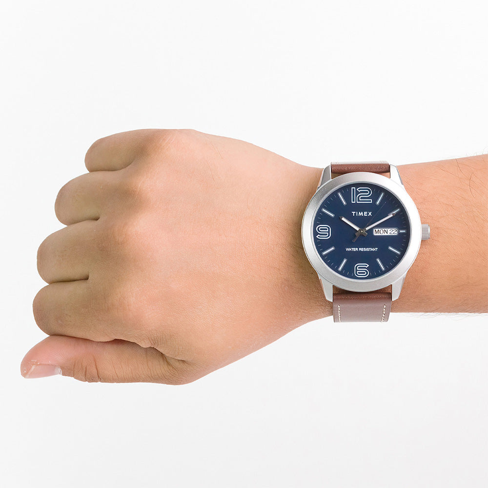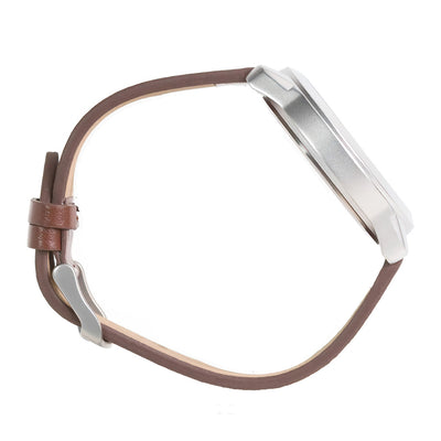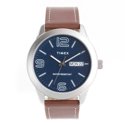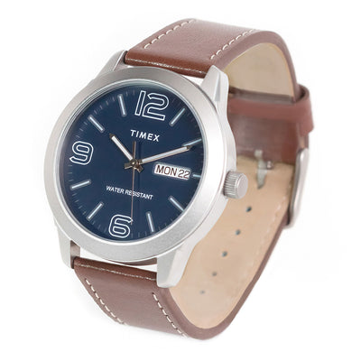 Never fail to make a statement with this oversized 45mm silver-tone case. With a carefully white stitched dark brown leather strap and matte blue dial, we brought our legendary quality to a modern look.