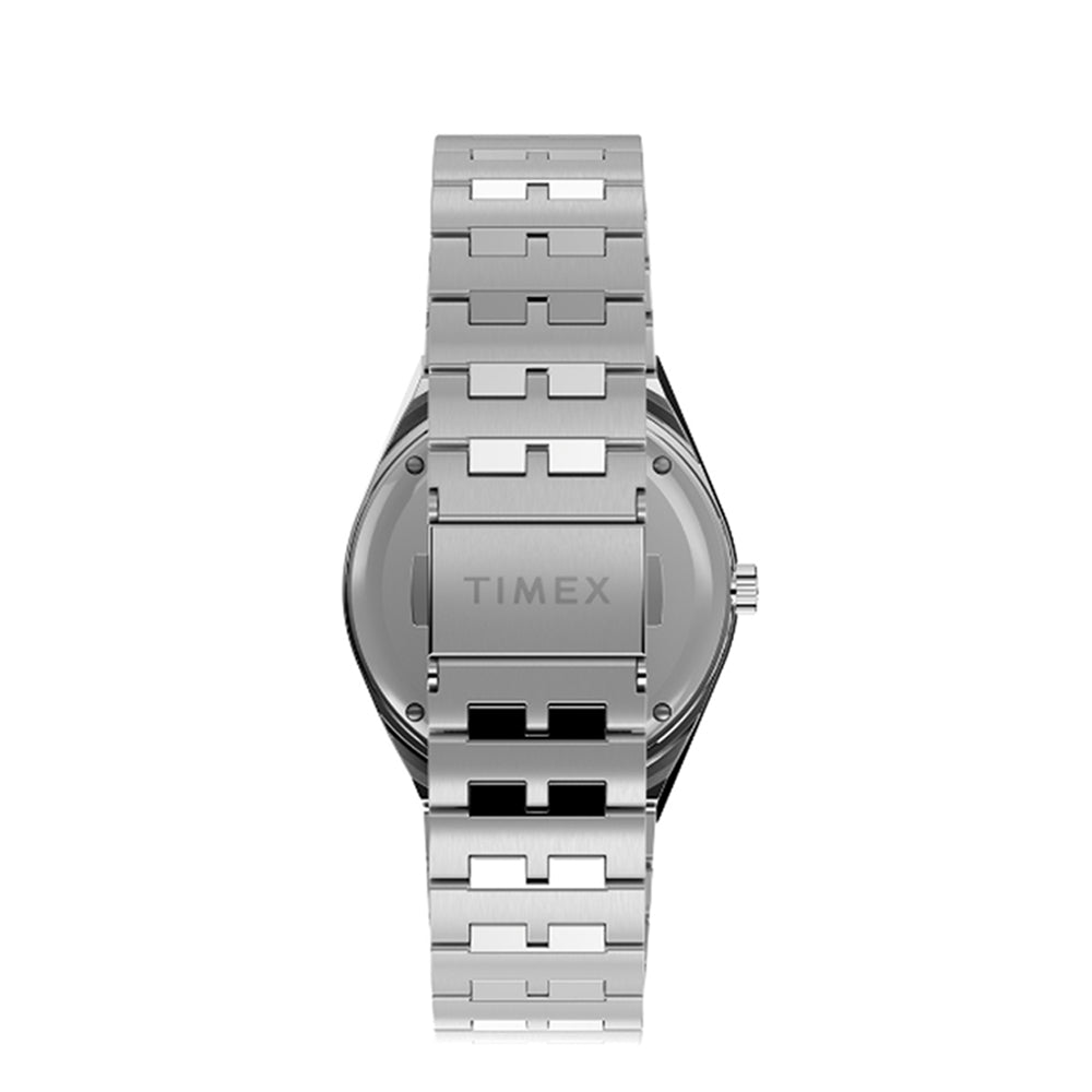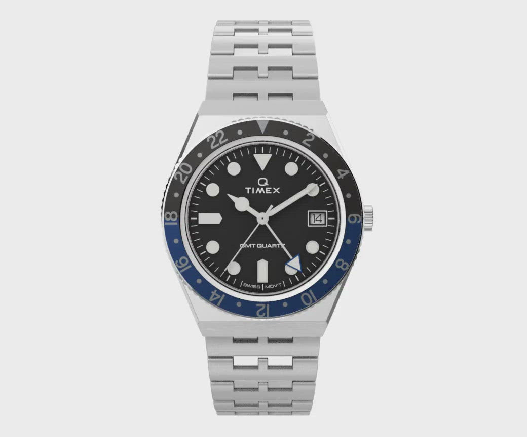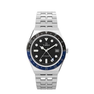 First released in the 1970s, our original Q Timex gave a new generation a modern watch with quartz technology. Now, our Q Timex GMT with a Swiss movement ?a natural evolution of the much-loved Q Timex 1979 Reissue?allows a new wave of jetsetters, time travelers, and global connections alike to set an additional time zone with its GMT movement. Iconic characteristics of the original?a black dial, black and blue rotating bezel, stainless-steel bracelet, functional battery hatch, and domed acrylic crystal, keep this wristwatch a time-honored classic.