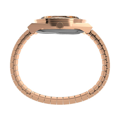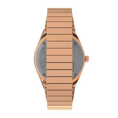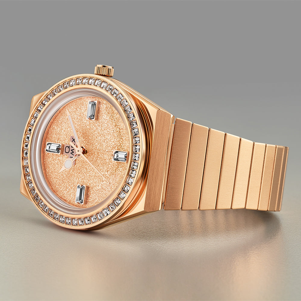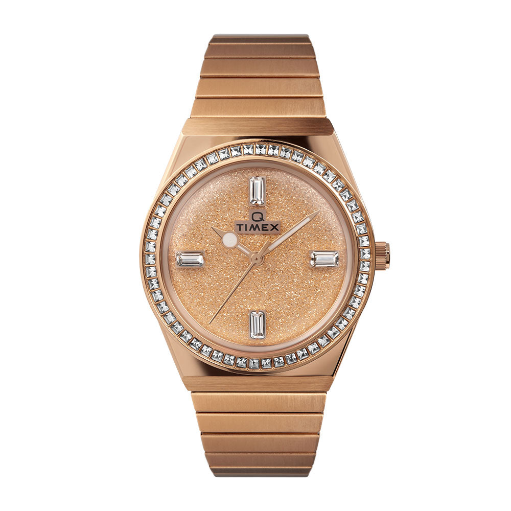 This dazzling timepiece elevates any outfit to the next level with a shimmering rose gold-tone diamond-dust dial, princess-cut crystal bezel, and baguette crystal markers. The stainless-steel case and Perfect Fit? expansion band combine to create a glamorous and elegant accessory you'll love to wear. At 36mm, it?s an ideal statement piece whether you?re dressing up for a special occasion or just looking to add some sparkle to your everyday look.