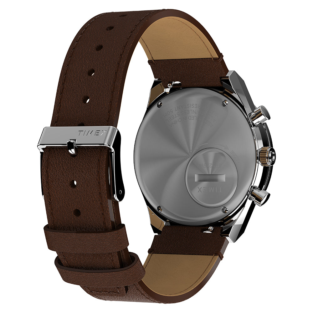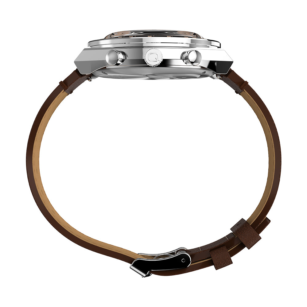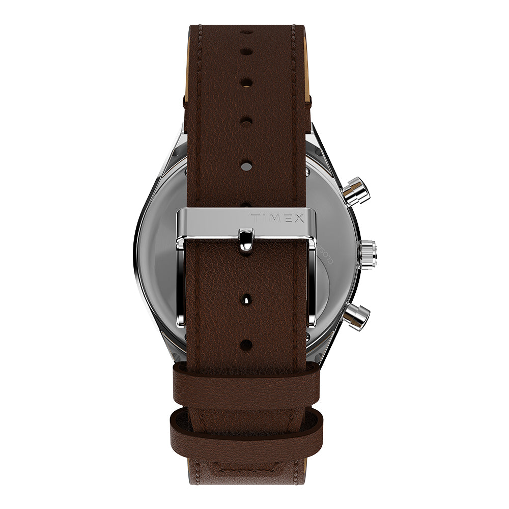 Roar across the finish line with our high-performing Q Timex® Chronograph. Inspired by the original motoring watches that graced the tracks of Europe’s most iconic races, this timepiece celebrates the endurance of our legendary 1970s Q Timex. An ultra-precise chronograph movement and tachymeter bezel recreate the finesse and function of a true racing watch, allowing you to determine elapsed time and average speed like the greatest daredevils in motorsports. Contrasting sub-dials, a date feature, hand-applied dimensional indices, and an updated Q Timex logo stand beautifully against a salmon dial, while a stainless-steel crown and brushed and polished 40mm stainless-steel case bring dynamism and durability to its retro construction. Infinitely wearable, it presents with a brown natural leather strap sourced from the Leather Working Group® (LWG).