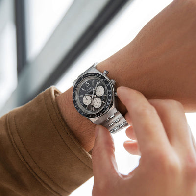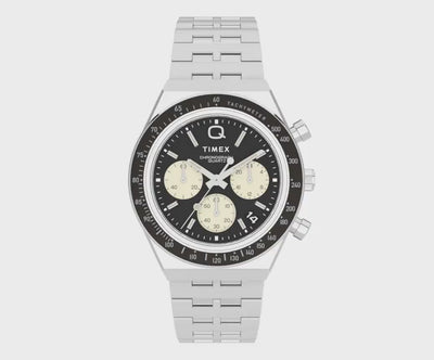 Roar across the finish line with our high-performing Q Timex Chronograph. Inspired by the original motoring watches that graced the tracks of Europe?s most iconic races, this timepiece celebrates the endurance of our legendary 1970s Q Timex. An ultra-precise chronograph movement and black tachymeter bezel recreate the finesse and function of a true racing watch, allowing you to determine elapsed time and average speed like the greatest daredevils in motorsports. Contrasting sub-dials, a date feature, hand-applied dimensional indices, and an updated Q Timex logo smolder against a jet-black dial, while a brushed and polished stainless-steel case and crown bring dynamism and durability to its retro construction. Infinitely wearable, an adjustable stainless-steel bracelet makes for a sporty presentation that?s ready to hit the road whenever you are.