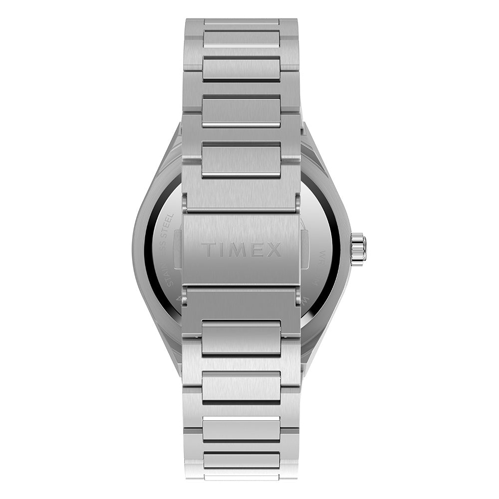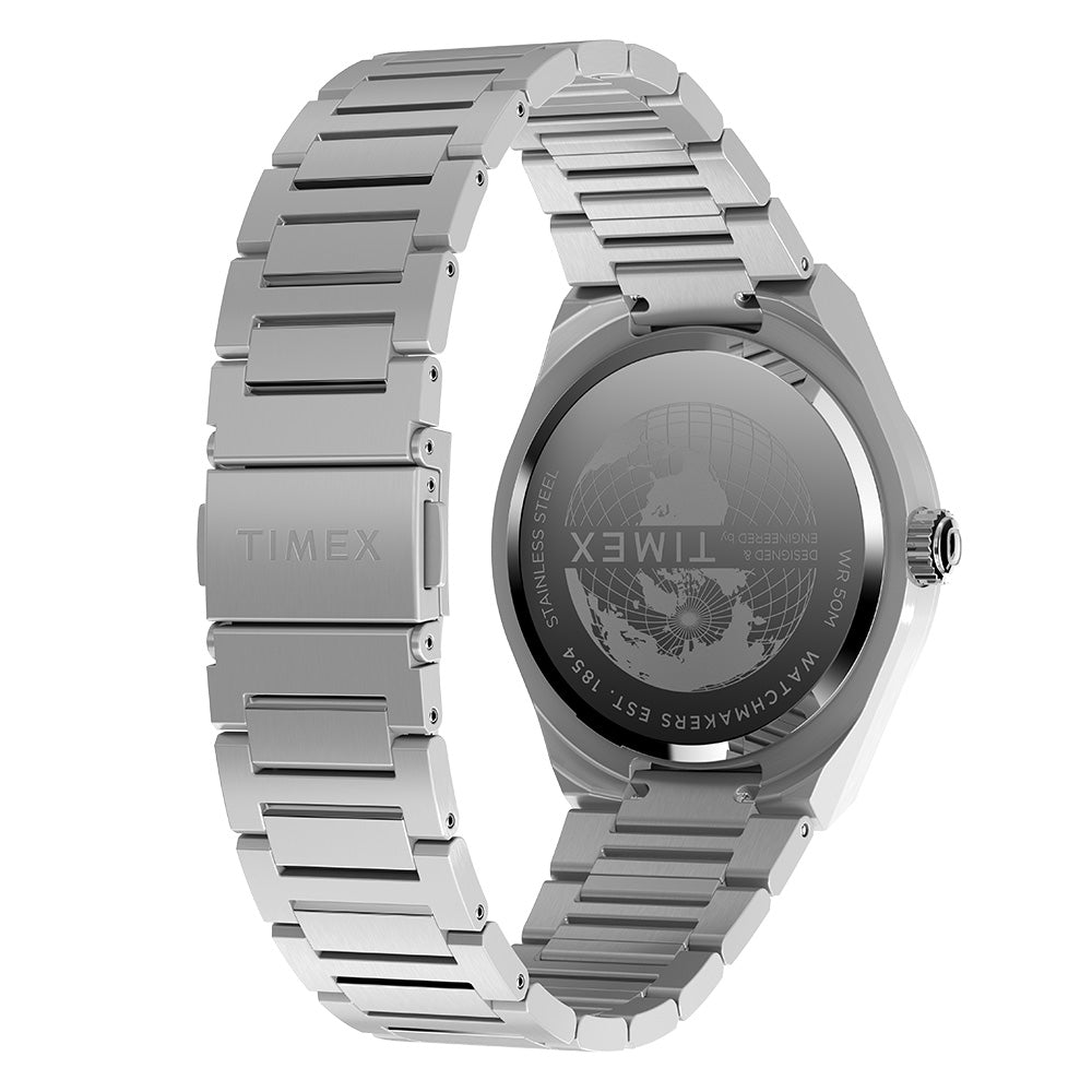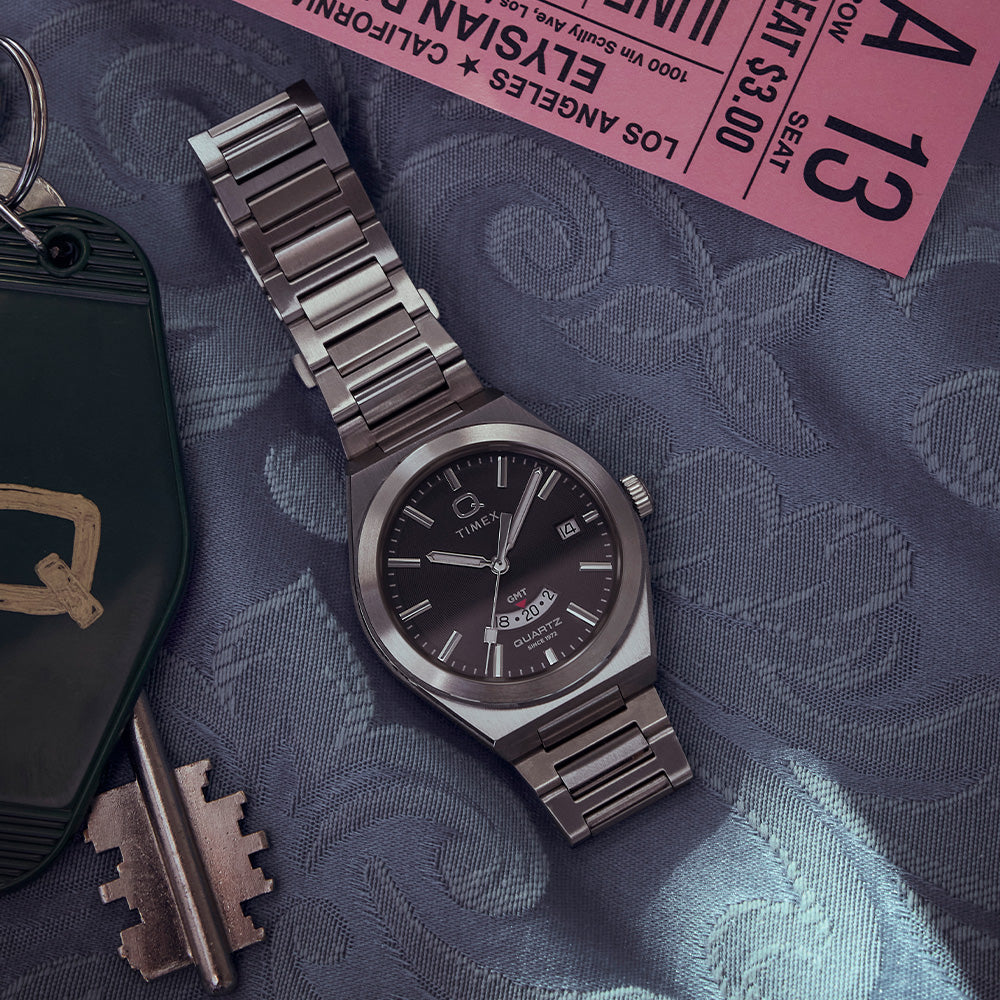 Channeling the bold designs and decadent glamour that filled the scene in ‘70s West Hollywood, the Q Timex® Continental GMT brings refinement to our beloved Q Timex collection with a new streamlined 39mm brushed stainless-steel case with polished edges and a sleek GMT function featuring a discreet display at 6 o’clock. The simple black or silver-tone dial features a radial texture and a clean presentation that’s effortlessly cool, highlighted by faceted hour markers, luminant hands for enhanced visibility in the dark, and a glanceable date window beside the 3rd hour marker. Completing the truly ‘70s style look is a tapered and integrated brushed stainless-steel bracelet.