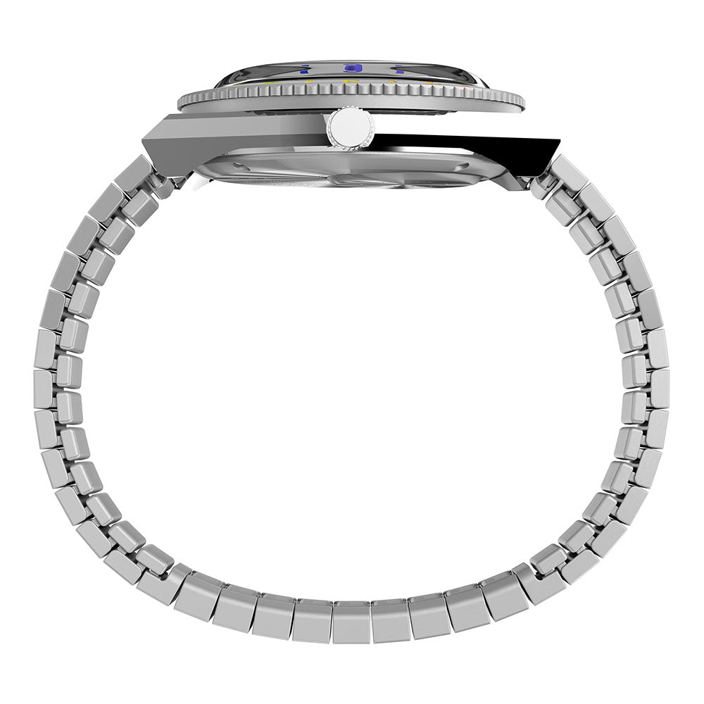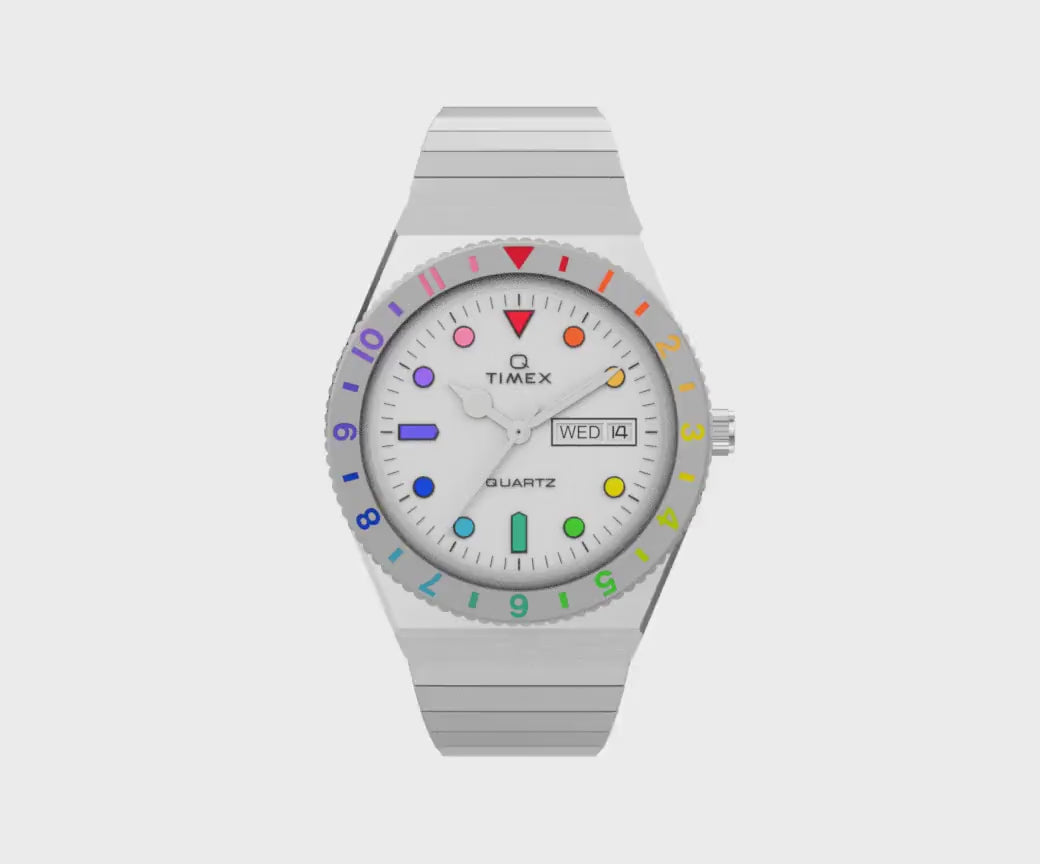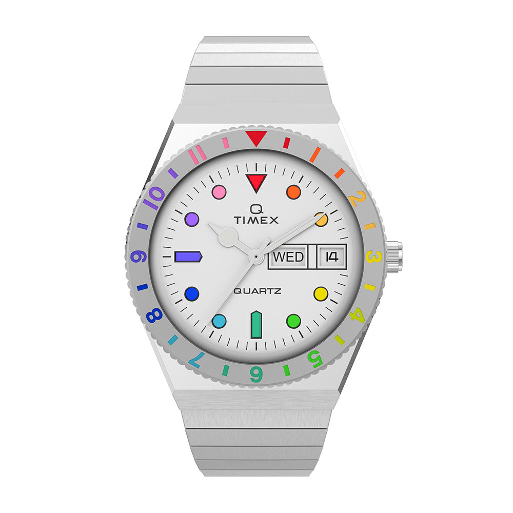 Live life in full color with this vibrant iteration of our archival Q Timex. We stayed true to the unique case silhouette, rotating top ring, and functional battery hatch of its 70s predecessor, but amped up the color with brilliant rainbow accents on the dial and bezel. On the wrist, this watch is as captivating as you might imagine; a black or silver-tone dial and case are complemented by a coordinating Perfect Fit expansion band with alternating rainbow links for a look that'll have everyone asking, where'd you get that??�