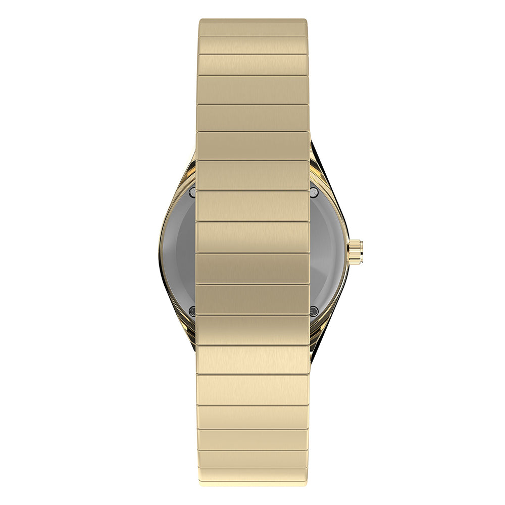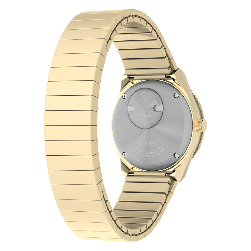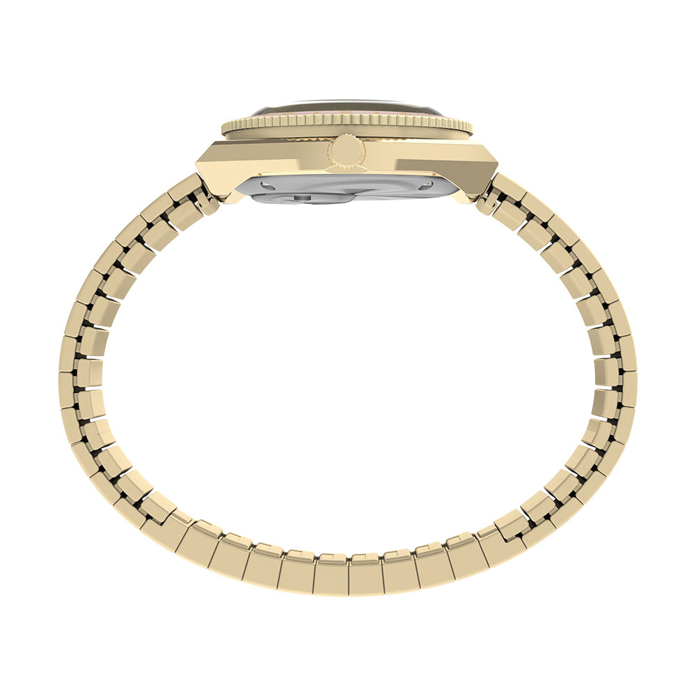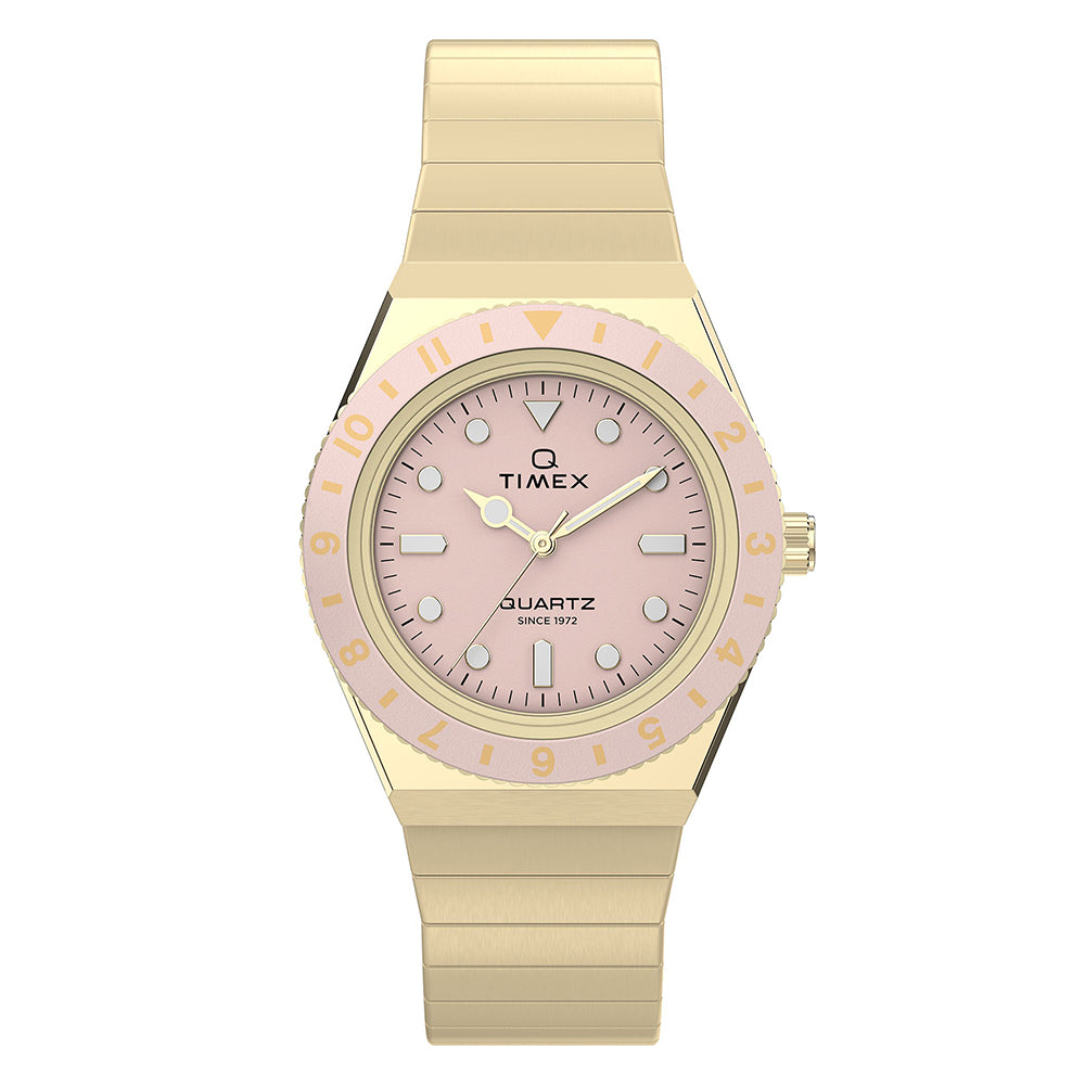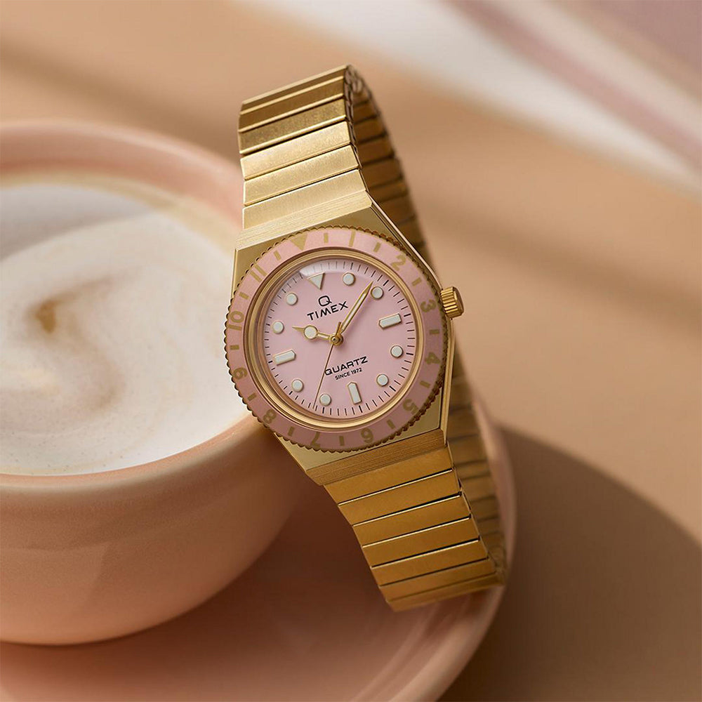 This petite take on our ‘70s Q Timex sports a tinier 30mm case and Perfect Fit expansion band in gold-tone stainless steel. Perfectly matching the pastel pink dial is a stationary top ring, and on the dial, you’ll find luminant markers and hands that make it easier to read the time when the lights are low.
