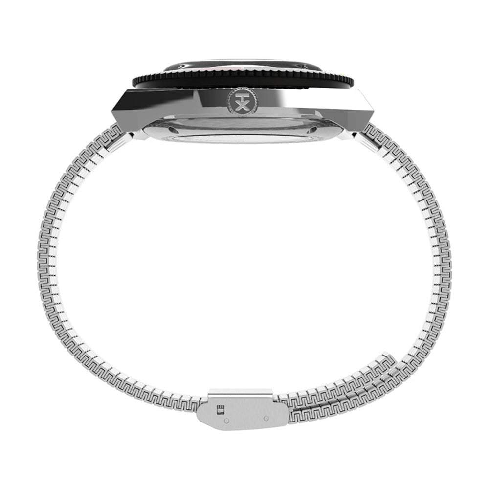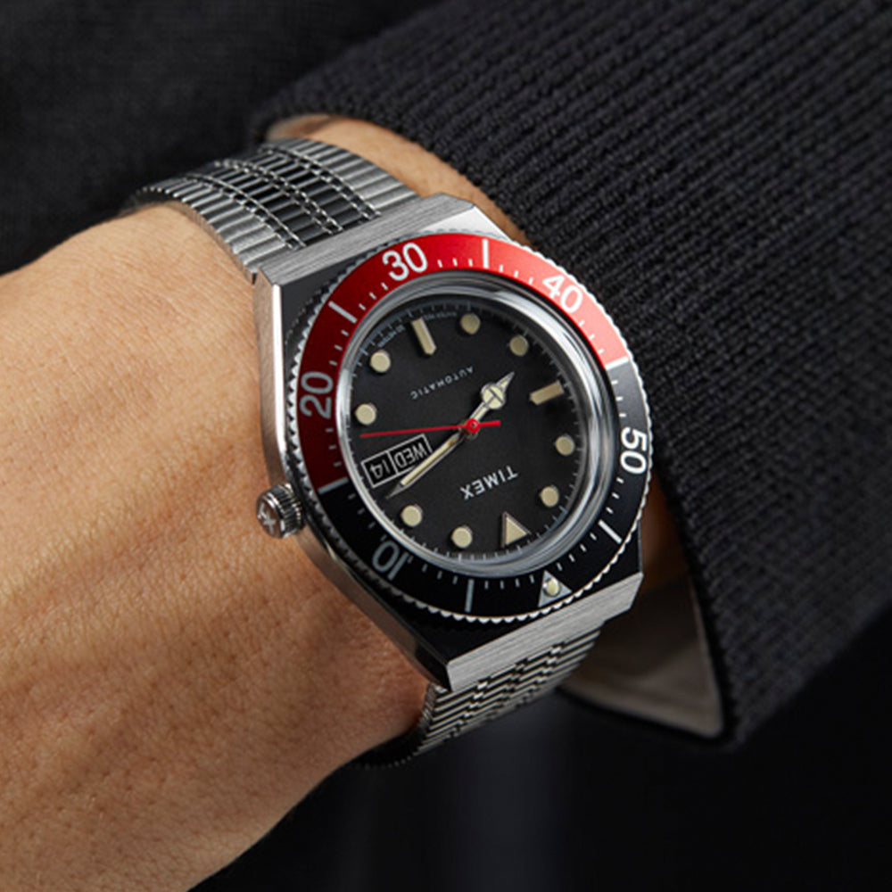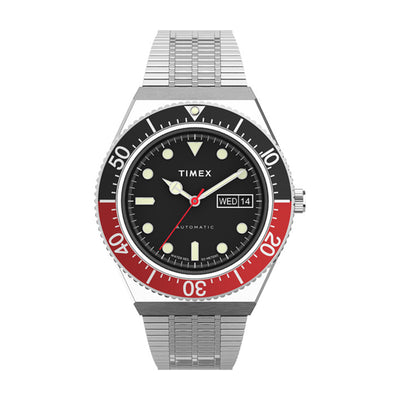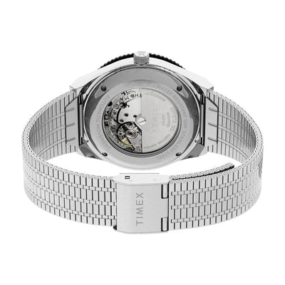 Our M79 Automatic is something entirely new, even though it might look familiar. Inspired by the 1970s Q Timex and elevated with a 21-jewel mechanical movement, this watch is a fresh interpretation of a much-loved Timex® icon. Powered by your movement, this automatic watch packs a 40-hour power reserve and can also be wound manually by using the crown. Featuring a unidirectional black and red bezel, black dial with luminous markings, a woven stainless-steel bracelet and exhibition case back, this modern watch captures the bold spirit of an era that changed everything.
