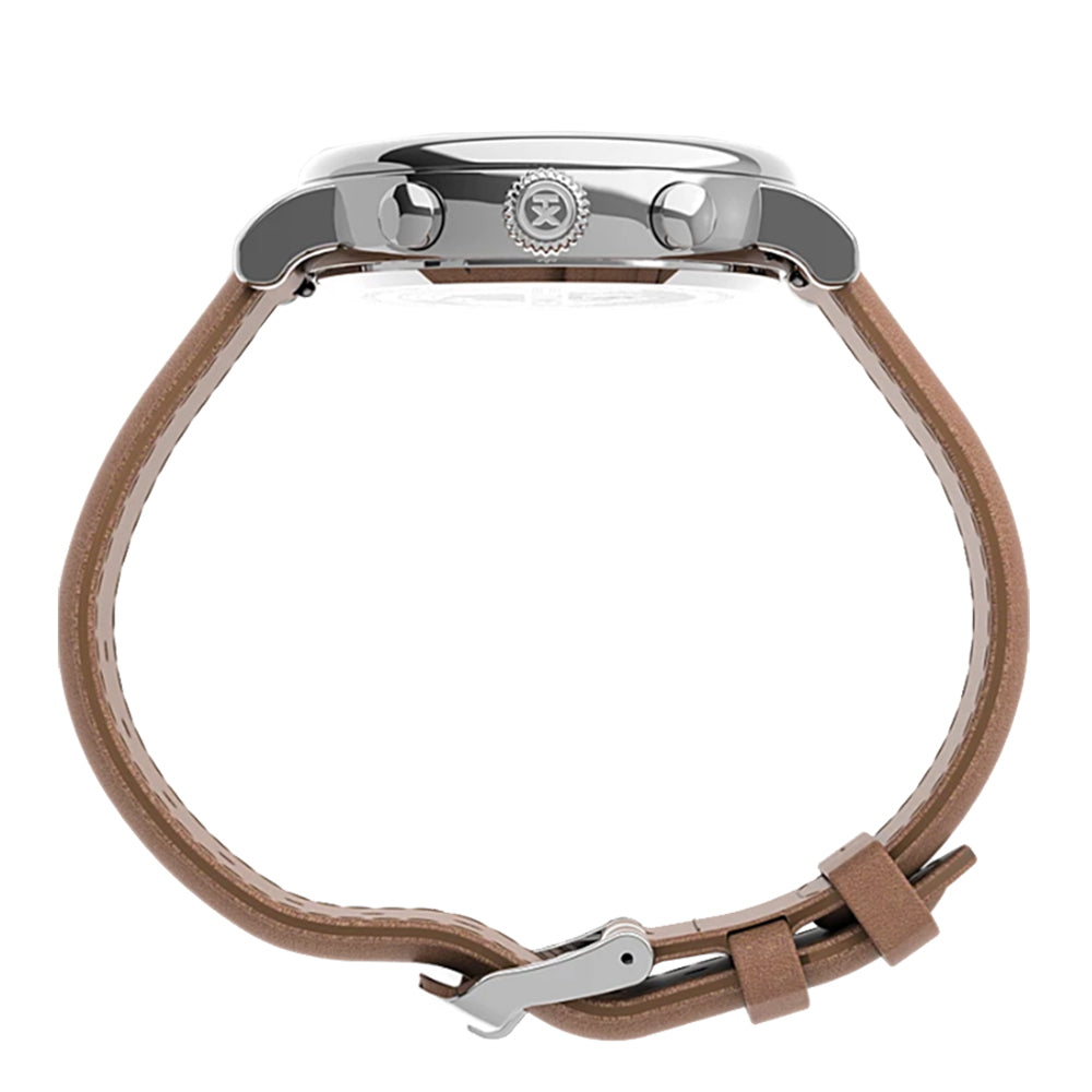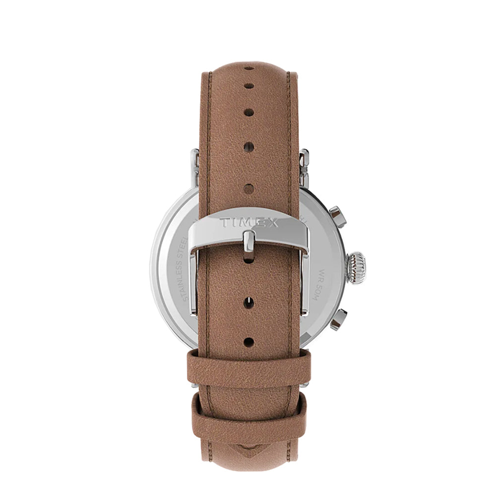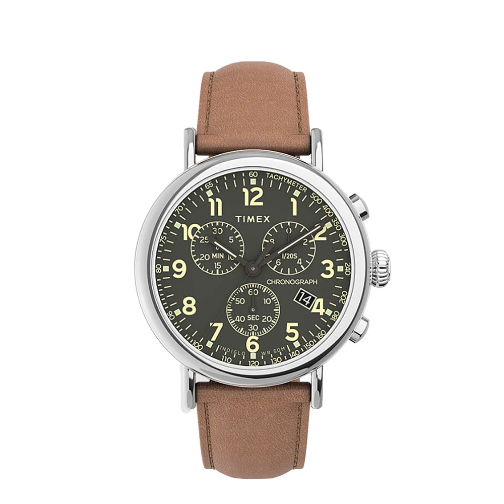 A casual way to wear a classic chronograph, the careful attention to detail allows the Timex Standard to shine as one of our most refined everyday watches. Designed with versatility in mind, this chronograph brings together classic elements with modern materials and easily interchangeable straps. The green chronograph dial and brown leather strap complement the silver-tone case and traditional oversized crown, a nod to our original pocket watches.