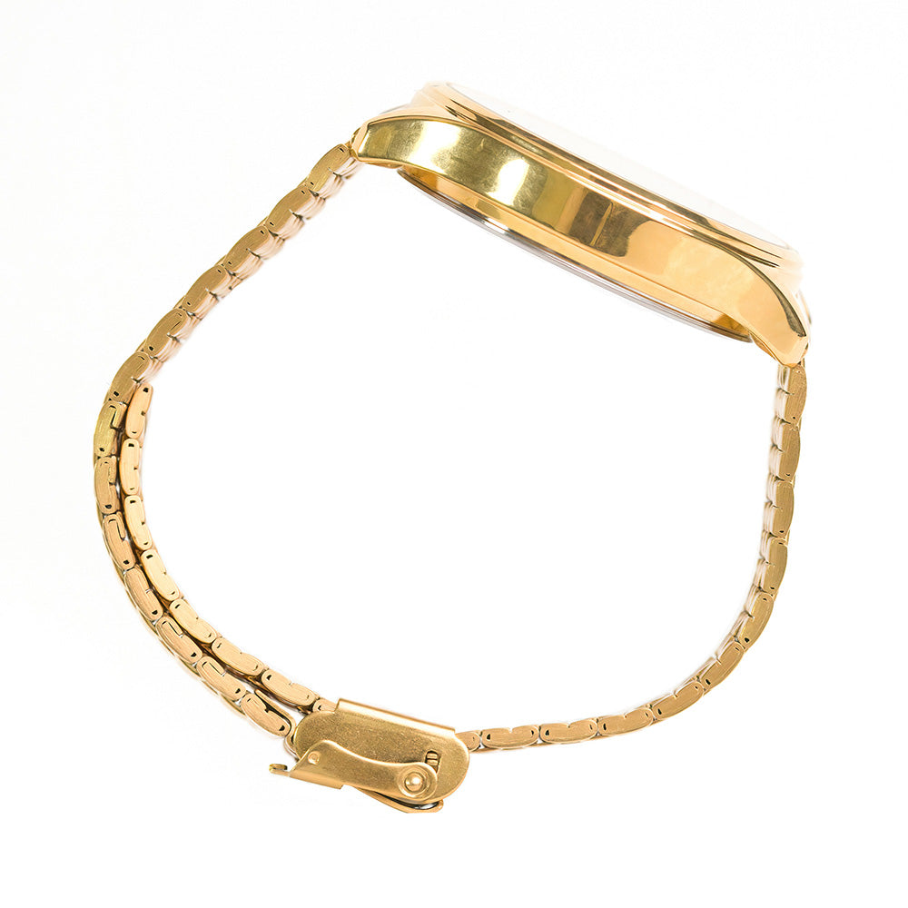 This classic analog watch for men features yellow gold accent case and stainless steel bracelet. the minimalist and sleek design of the yellow gold dial provides a clear display of the time to make telling the time easier than ever before. over-all, the stunning gold accents creates a perfect balance of elegance and simplicity, that will help exude confidence to every gentleman wearing it.