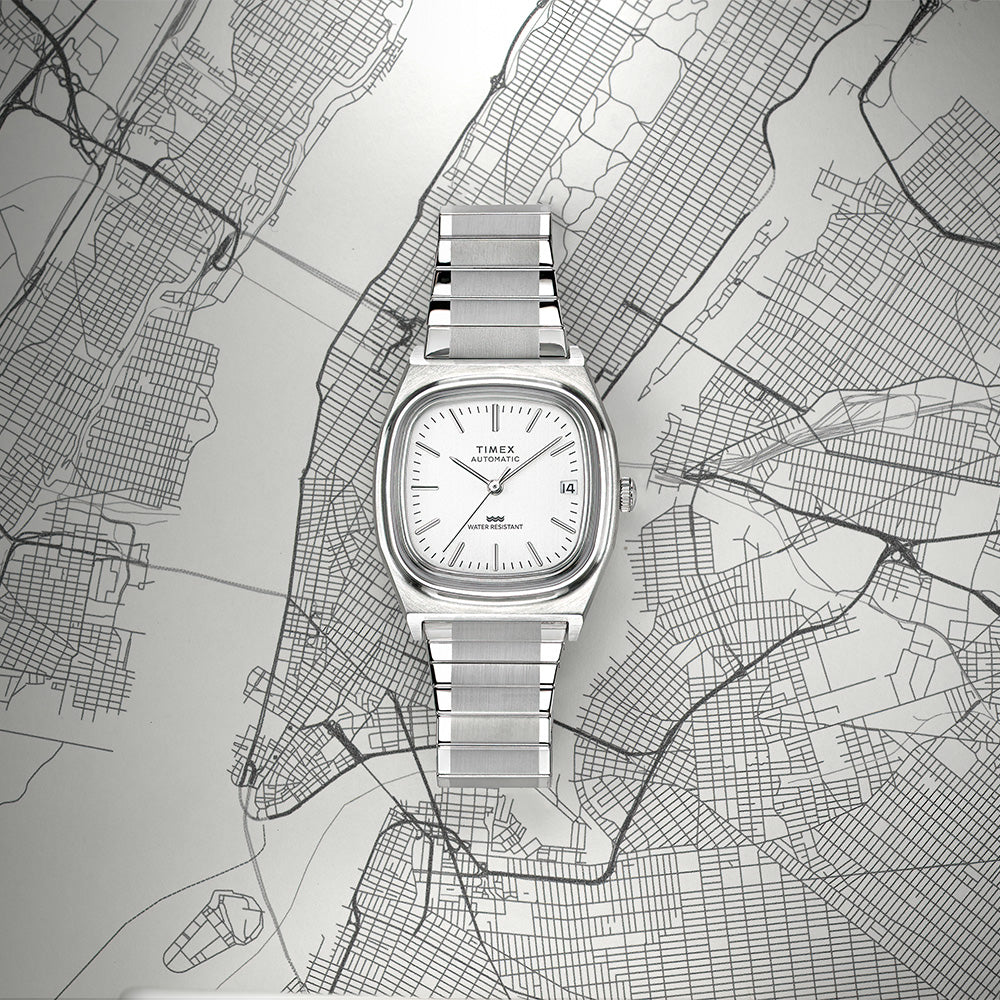 Originally unleashed onto the scene in 1983, the Timex Automatic 1983 E Line Reissue is a classic dress watch distinguished by a rounded square case shape affectionately dubbed the ˜TV Dial.' For this modern-day reissue, we've upgraded its construction to stainless-steel and powered it with a 21-jewel Japanese automatic movement that brings the first automatic to our line of reissues. Completing its smooth profile is a brushed and polished stainless-steel expansion band enhanced with our Perfect Fit technology, a vintage-style acrylic crystal, and a discreet date window seamlessly integrated into the clean dial at 3 o'clock.