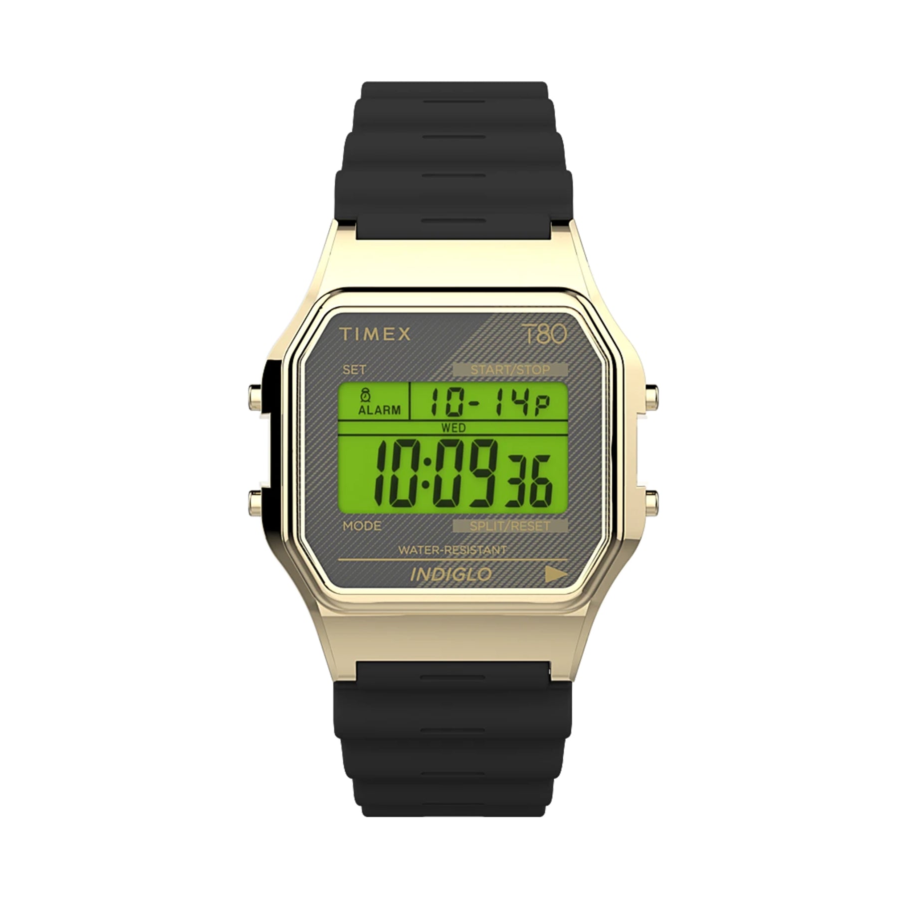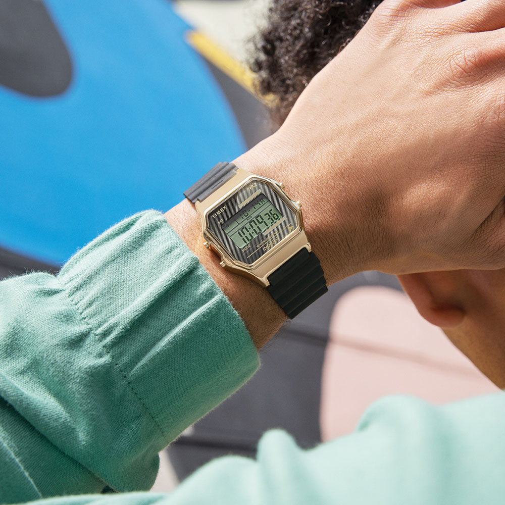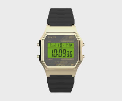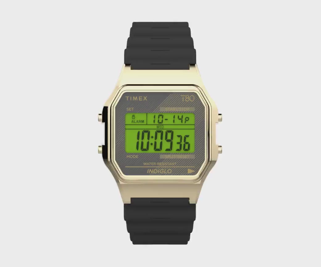 Our T80 is a throwback to the decade that gave us big hair, big music, and big dreams. It also pays homage to our original digital watches, some of the first to hit the market. To honor those early hits, we?re proudly reintroducing the T80 to a whole new generation?a watch that?s both a stylish accessory and a serious timekeeping device. The fun, retro design packs a date display, stopwatch, alarm, and INDIGLO® backlight into something that looks great no matter where you?re going from here. Rock your T80 your way with a black resin strap and color-coordinated lens.