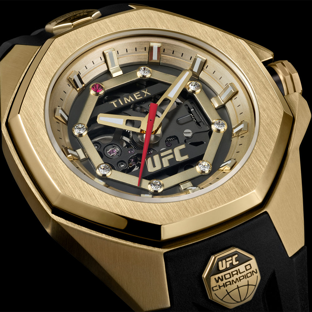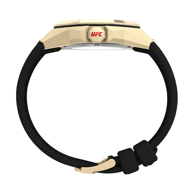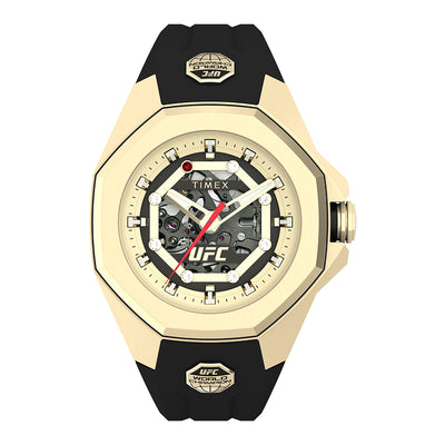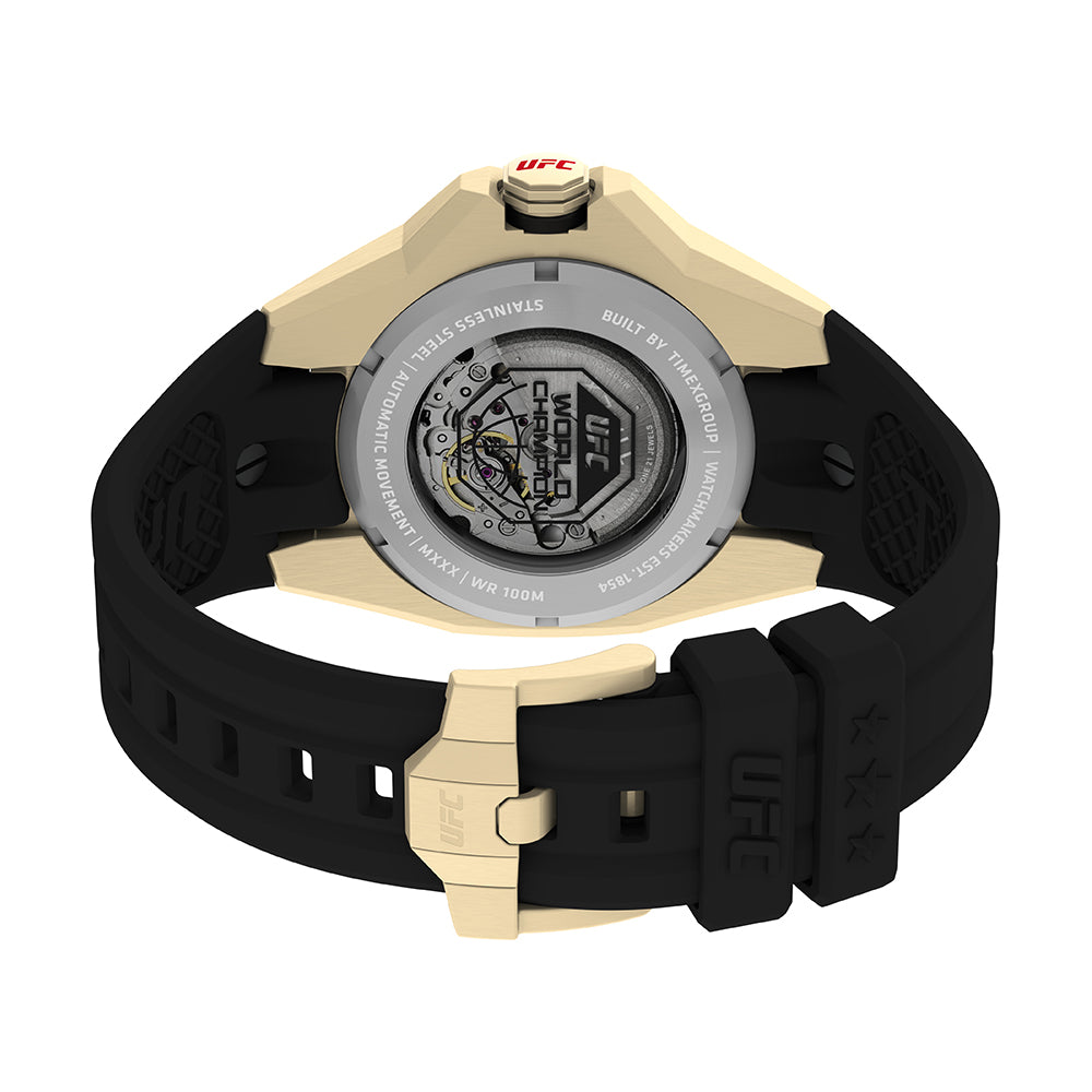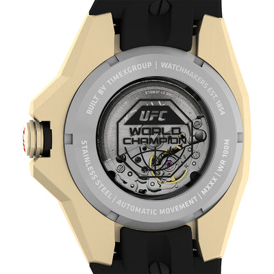 The UFC Pro Automatic packs a punch in two classes: style and substance. Its bold 45mm stainless-steel case and bezel demand attention, while the rugged silicone strap can handle the toughest challenges. This watch is powered by a Japanese automatic movement that?s showcased through the skeleton dial and exhibition case back, allowing you to marvel at its inner workings. Inspired by the iconic UFC Championship belt, the dial features a synthetic ruby as the 11th hour marker, adding a touch of luxury to this powerful timepiece. And with 100m of water resistance, you can wear it with confidence in any weather.?