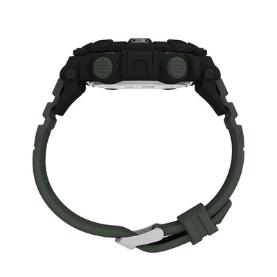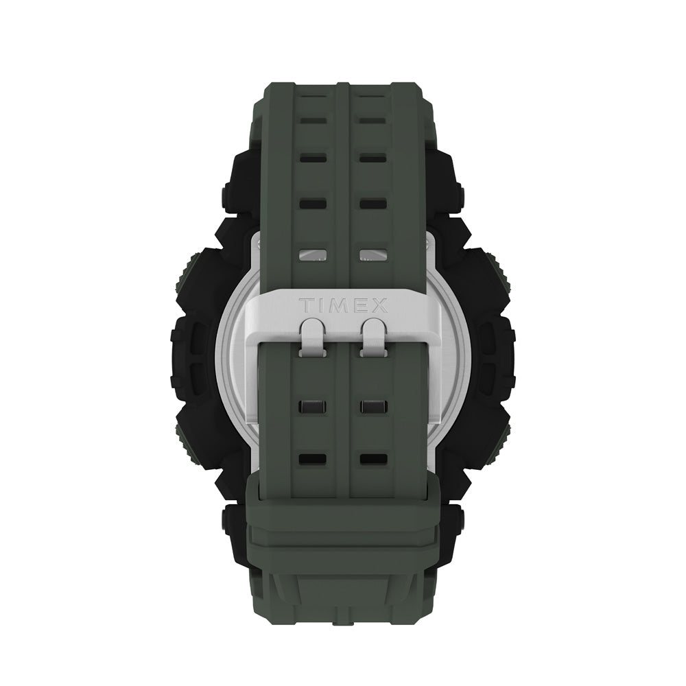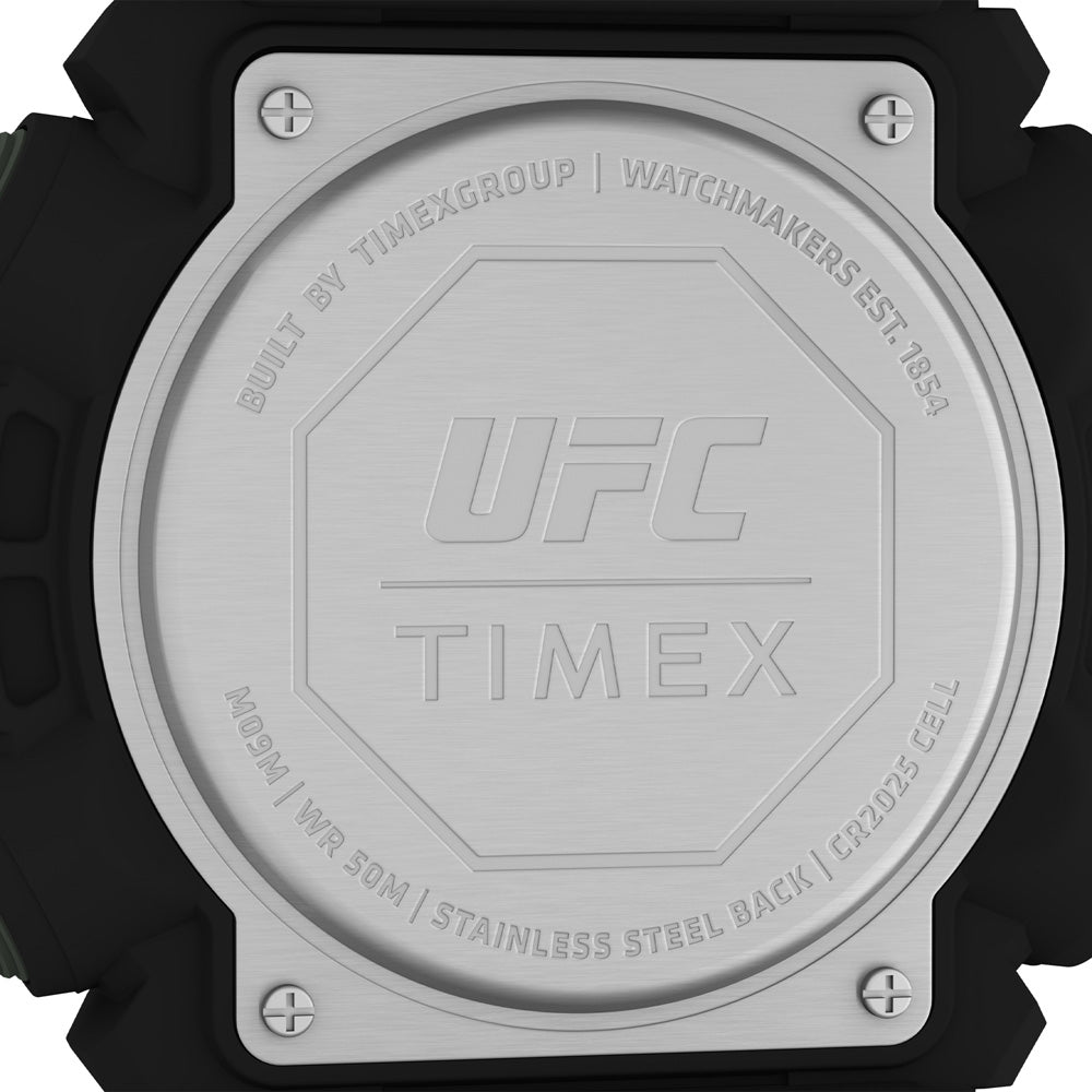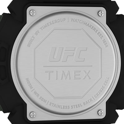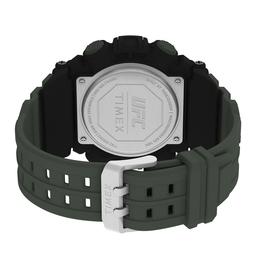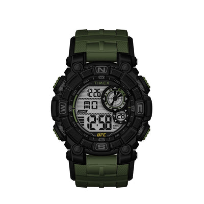 Deceivingly lightweight despite its hardy exterior, the iconic five-button design of the TIMEX UFC Redemption gives you direct access to a 100-hour chronograph, 24-hour countdown timer, military time, dual time zones, alarm, and our revolutionary INDIGLO® backlight. It?s sealed for water resistance up to 50m and equipped with a compass bezel and military-green molded resin straps for lasting durability. The textured tactile design of its pushers and substantial black 50mm case profile are immensely practical features if you?re in the middle of training?simply reach down, feel for the pusher, and finish the challenge without interruption.