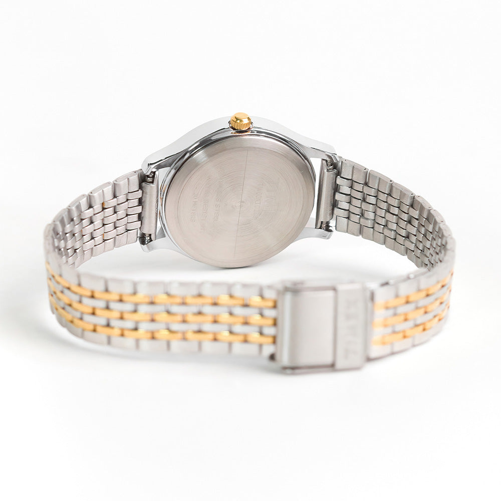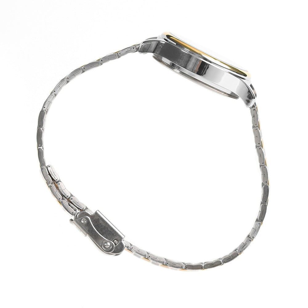 This classic analog watch for ladies features two-tone yellow gold and silver accent case and stainless steel bracelet. the minimalist and sleek design of the silver white dial provides a clear display of the time to make telling the time easier than ever before. over-all, the stunning gold and silver accents creates a perfect balance of elegance and simplicity, that will help exude confidence to every woman wearing it.